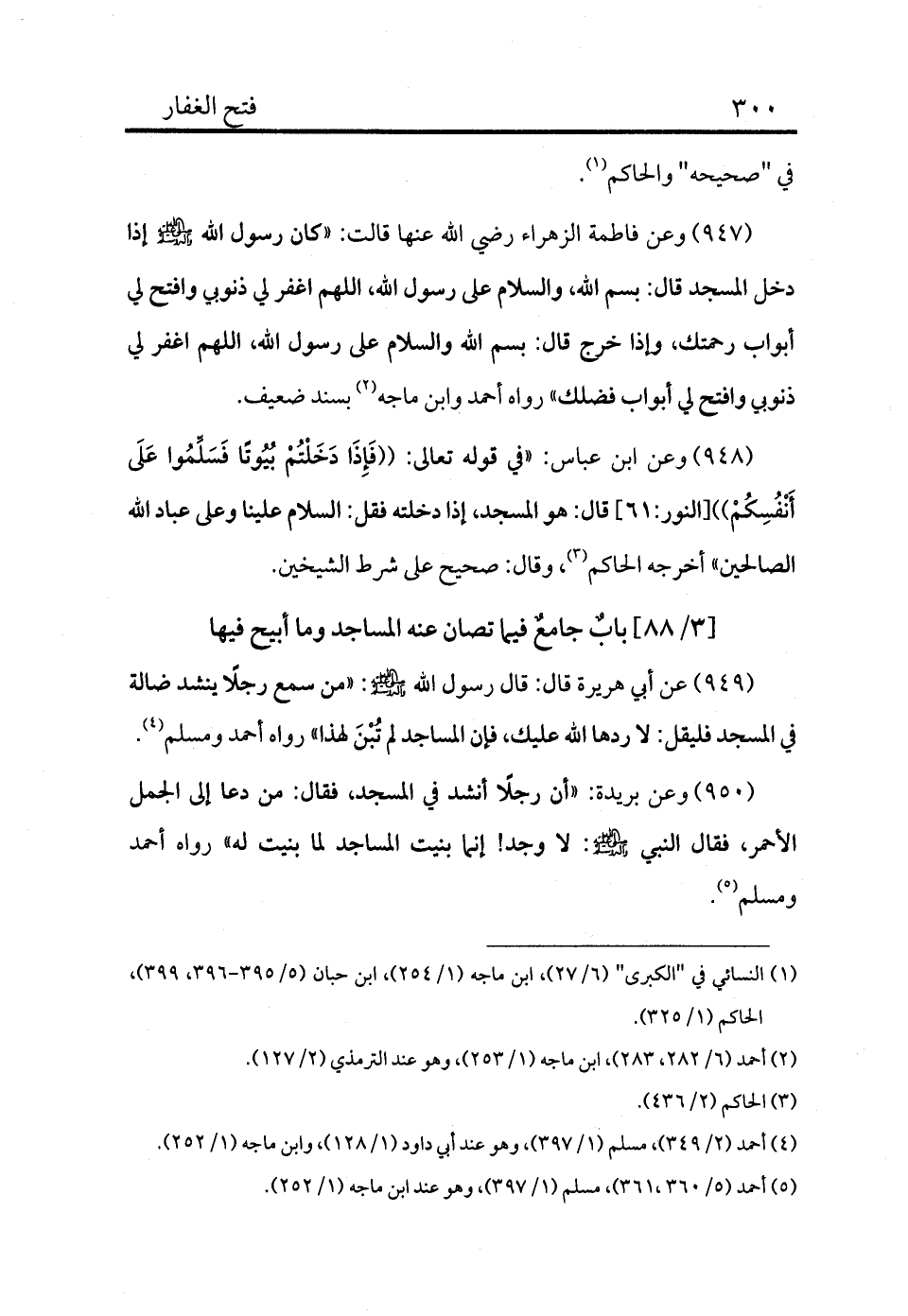 947 - وعن فاطمة الزهراء رضي الله عنها قالت: «كان رسول الله - صلى الله عليه وسلم - إذا دخل المسجد قال: بسم الله، والسلام على رسول الله، اللهم اغفر لي ذنوبي وافتح لي أبواب رحمتك، وإذا خرج قال: بسم الله والسلام على رسول الله، اللهم اغفر لي ذنوبي وافتح لي أبواب فضلك» رواه أحمد وابن ماجه (¬2) بسند ضعيف.