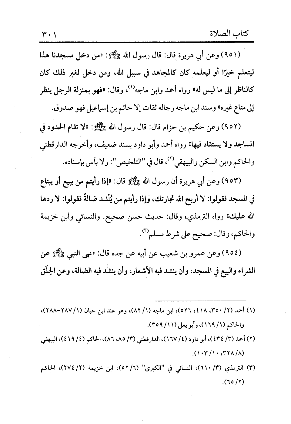 953 - وعن أبي هريرة أن رسول الله - صلى الله عليه وسلم - قال: «إذا رأيتم من يبيع أو يبتاع في المسجد فقولوا: لا أربح الله تجارتك، وإذا رأيتم من يُنْشد ضالةً فقولوا: لا ردها الله عليك» رواه الترمذي، وقال: حديث حسن صحيح، والنسائي وابن خزيمة والحاكم، وقال: صحيح على شرط مسلم (¬3) .