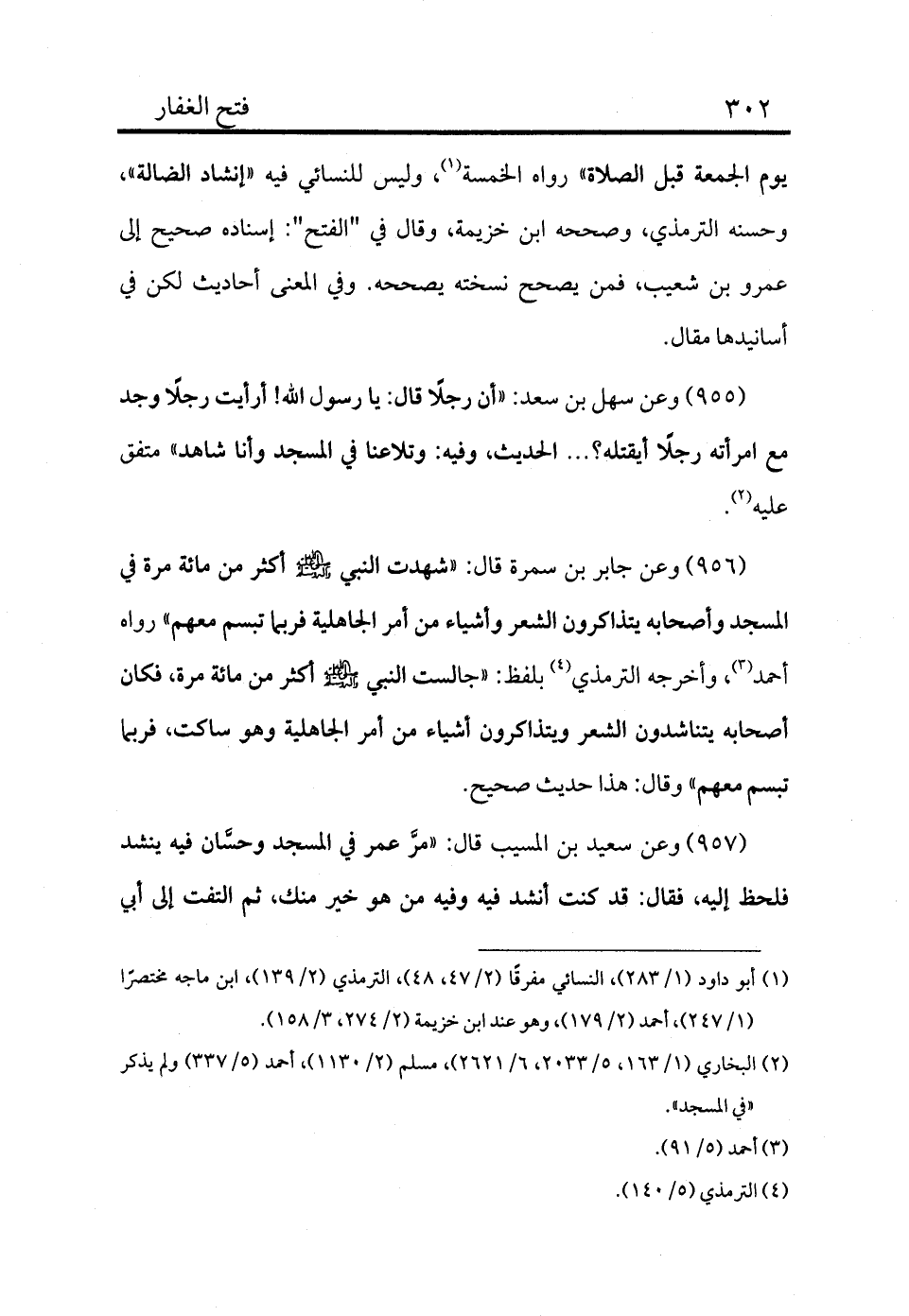 956 - وعن جابر بن سمرة قال: «شهدت النبي - صلى الله عليه وسلم - أكثر من مائة مرة في المسجد وأصحابه يتذاكرون الشعر وأشياء من أمر الجاهلية فربما تبسم معهم» رواه أحمد (¬3) ، وأخرجه الترمذي (¬4) بلفظ: «جالست النبي - صلى الله عليه وسلم - أكثر من مائة مرة، فكان أصحابه يتناشدون الشعر ويتذاكرون أشياء من أمر الجاهلية وهو ساكت، فربما تبسم معهم» وقال: هذا حديث صحيح.