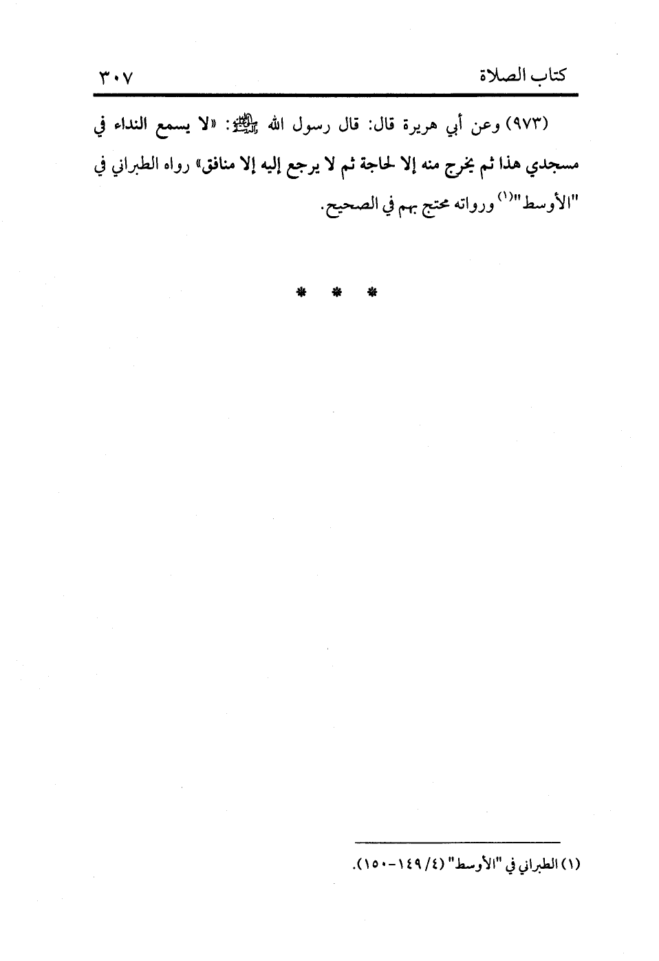 973 - وعن أبي هريرة قال: قال رسول الله - صلى الله عليه وسلم -: «لا يسمع النداء في مسجدي هذا ثم يخرج منه إلا لحاجة ثم لا يرجع إليه إلا منافق» رواه الطبراني في "الأوسط" (¬1) ورواته محتج بهم في الصحيح.