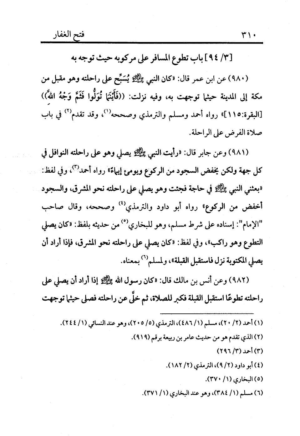 980 - عن ابن عمر قال: «كان النبي - صلى الله عليه وسلم - يُسَبِّح على راحلته وهو مقبل من مكة إلى المدينة حيثما توجهت به، وفيه نزلت: ((فَأَيْنَمَا تُوَلُّوا فَثَمَّ وَجْهُ اللَّهِ)) [البقرة:115] » رواه أحمد ومسلم والترمذي وصححه (¬1) ، وقد تقدم (¬2) في باب صلاة الفرض على الراحلة.