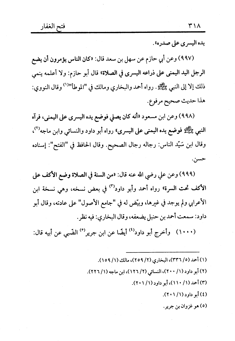 998 - وعن ابن مسعود «أنه كان يصلي فوضع يده اليسرى على اليمنى، فرآه النبي - صلى الله عليه وسلم - فوضع يده اليمنى على اليسرى» رواه أبو داود والنسائي وابن ماجه (¬2) ، وقال ابن سَيّد الناس: رجاله رجال الصحيح، وقال الحافظ في "الفتح": إسناده حسن.