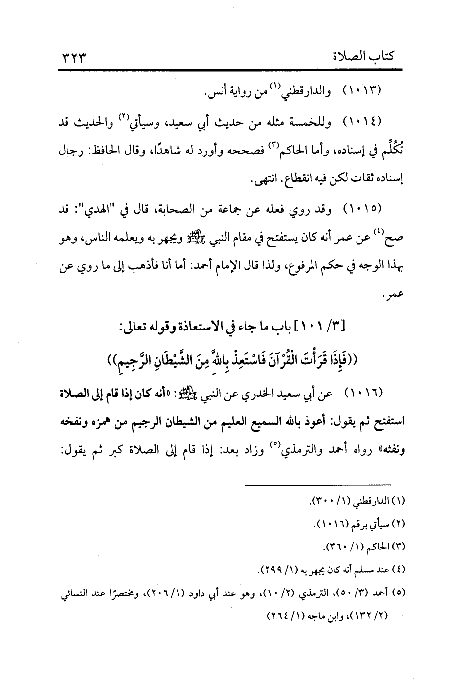 1016 - عن أبي سعيد الخدري عن النبي - صلى الله عليه وسلم -: «أنه كان إذا قام إلى الصلاة استفتح ثم يقول: أعوذ بالله السميع العليم من الشيطان الرجيم من همزه ونفخه ونفثه» رواه أحمد والترمذي (¬5) وزاد بعد: إذا قام إلى الصلاة كبر ثم يقول: «سبحانك اللهم وبحمدك وتبارك اسمك وتعالى جدك ولا إله غيرك، ثم يقول: الله أكبر الله أكبر، ثم يقول: