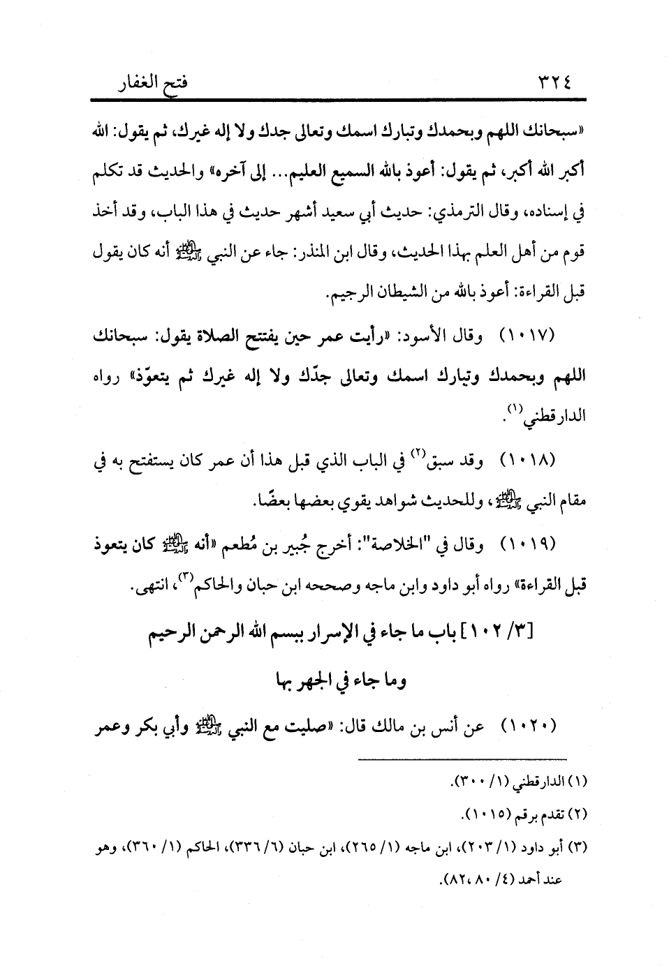 1017 - وقال الأسود: «رأيت عمر حين يفتتح الصلاة يقول: سبحانك اللهم وبحمدك وتبارك اسمك وتعالى جدّك ولا إله غيرك ثم يتعوّذ» رواه الدارقطني (¬1) .