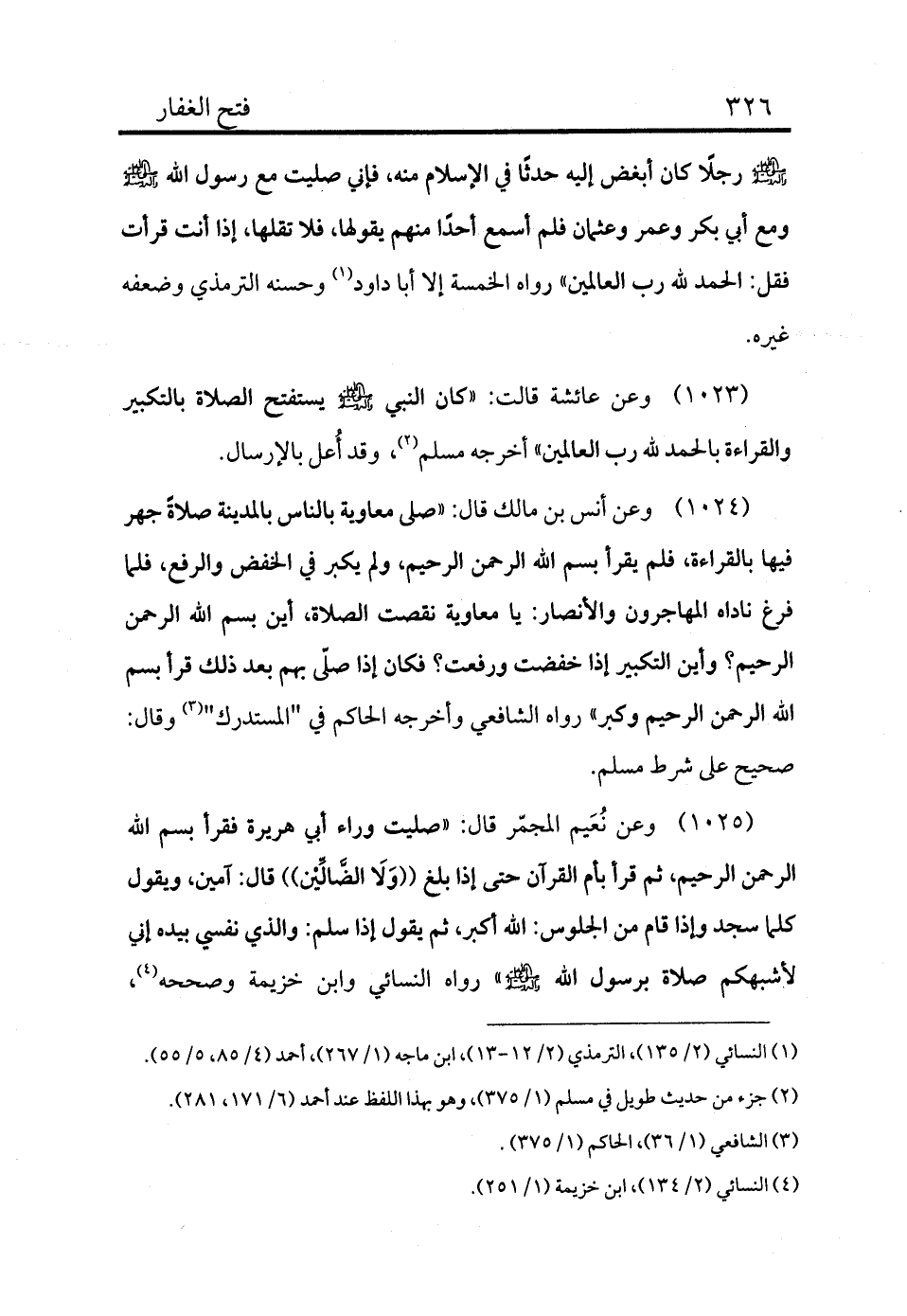1025 - وعن نُعَيم المجمّر قال: «صليت وراء أبي هريرة فقرأ بسم الله الرحمن الرحيم، ثم قرأ بأم القرآن حتى إذا بلغ ولا الضالين قال: آمين، ويقول كلما سجد وإذا قام من الجلوس: الله أكبر، ثم يقول إذا سلم: والذي نفسي بيده إني لأشبهكم صلاة برسول الله - صلى الله عليه وسلم -» رواه النسائي وابن خزيمة وصححه (¬4) ،