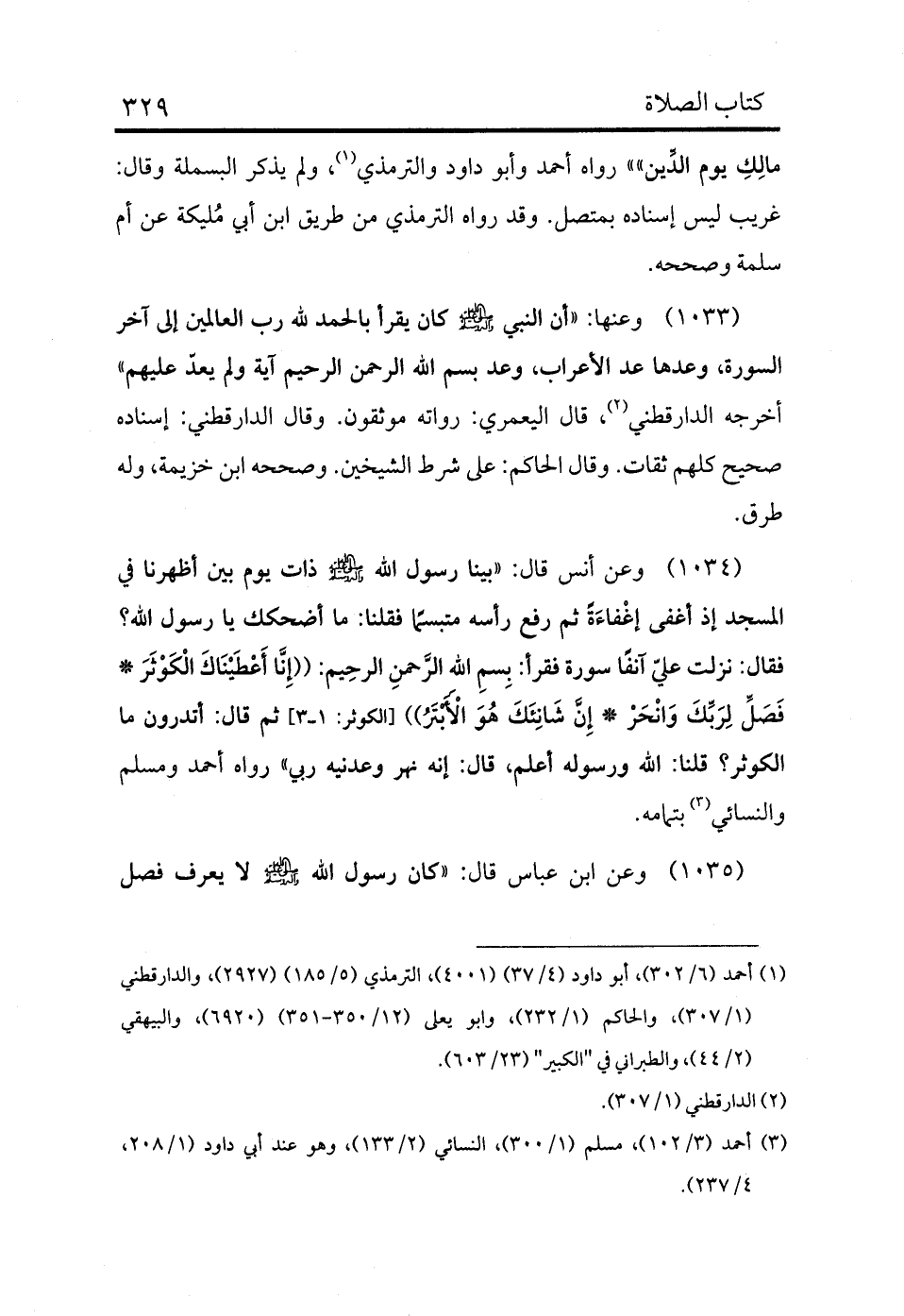 1034 - وعن أنس قال: «بينا رسول الله - صلى الله عليه وسلم - ذات يوم بين أظهرنا في المسجد إذ أغفى إغْفاءَةً ثم رفع رأسه متبسمًا فقلنا: ما أضحكك يا رسول الله؟ فقال: نزلت علي آنفًا سورة فقرأ: بِسمِ اللهِ الرَّحمنِ الرحِيم: ((إِنَّا أَعْطَيْنَاكَ الْكَوْثَرَ * فَصَلِّ لِرَبِّكَ وَانْحَرْ * إِنَّ شَانِئَكَ هُوَ الْأَبْتَرُ)) [الكوثر:3] ثم قال: أتدرون ما الكوثر؟ قلنا: الله ورسوله أعلم، قال: إنه نهر وعدنيه ربي» رواه أحمد ومسلم والنسائي (¬3) بتمامه.