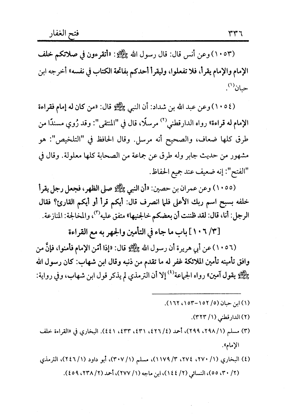 1053 - وعن أنس قال: قال رسول الله - صلى الله عليه وسلم -: «أتقرءون في صلاتكم خلف الإمام والإمام يقرأ، فلا تفعلوا، وليقرأ أحدكم بفاتحة الكتاب في نفسه» أخرجه ابن حبان (¬1) .