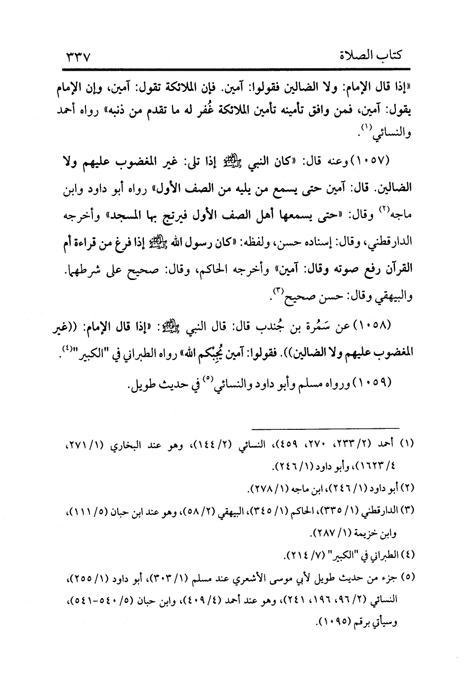 1058 - عن سَمُرة بن جُندب قال: قال النبي - صلى الله عليه وسلم -: «إذا قال الإمام: غير المغضوب عليهم ولا الضالين. فقولوا: آمين يجبكم الله» رواه الطبراني في "الكبير" (¬4) .