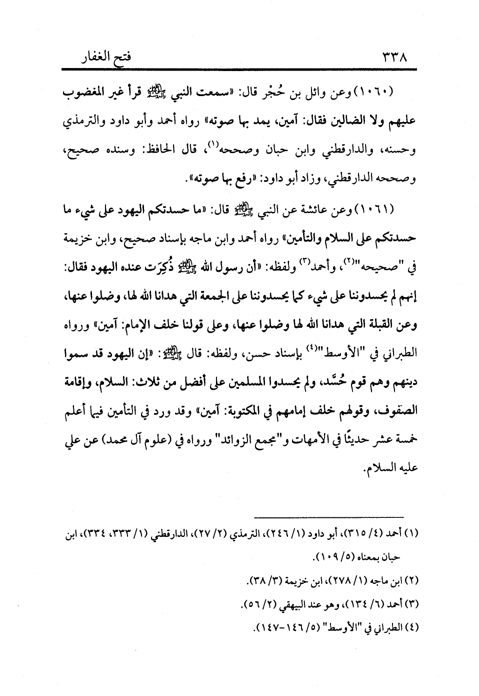 1061 - وعن عائشة عن النبي - صلى الله عليه وسلم - قال: «ما حسدتكم اليهود على شيء ما حسدتكم على السلام والتأمين» رواه أحمد وابن ماجه بإسناد صحيح، وابن خزيمة في "صحيحه" (¬2) ، وأحمد (¬3) ولفظه: «أن رسول الله - صلى الله عليه وسلم - ذكرت عنده اليهود فقال: إنهم لم يحسدوننا على شيء كما يحسدوننا على الجمعة التي هدانا الله لها، وضلوا عنها، وعن القبلة التي هدانا الله لها وضلوا عنها، وعلى قولنا خلف الإمام: آمين» ورواه الطبراني في "الأوسط" (¬4) بإسناد حسن ولفظه: قال - صلى الله عليه وسلم -: «إن اليهود قد سموا دينهم وهم قوم حُسَّد، ولم يحسدوا المسلمين على أفضل من ثلاث: السلام، وإقامة الصفوف، وقولهم خلف إمامهم في المكتوبة: آمين» وقد ورد في التأمين فيما أعلم خمسة عشر حديثًا في الأمهات و"مجمع الزوائد" ورواه في علوم آل محمد عن علي عليه السلام.
