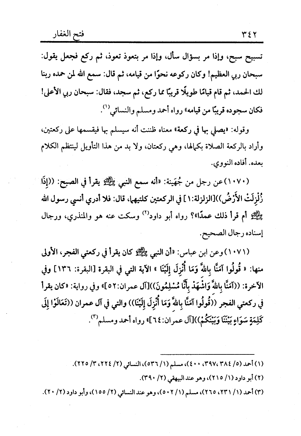 1070 - عن رجل من جُهَينة: «أنه سمع النبي - صلى الله عليه وسلم - يقرأ في الصبح: ((إِذَا زُلْزِلَتْ الأَرْضُ)) [الزلزلة:1] في الركعتين كلتيهما، قال: فلا أدري أنسي رسول الله - صلى الله عليه وسلم - أم قرأ ذلك عمدًا» رواه أبو داود (¬2) وسكت عنه هو والمنذري، ورجال إسناده رجال الصحيح.