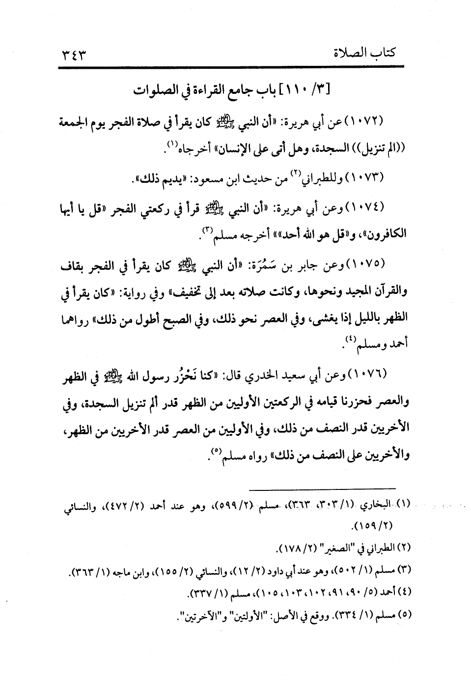 1075 - وعن جابر بن سَمُرَة: «أن النبي - صلى الله عليه وسلم - كان يقرأ في الفجر بقاف والقرآن المجيد ونحوها، وكانت صلاته بعد إلى تخفيف» وفي رواية: «كان يقرأ في الظهر بالليل إذا يغشى وفي العصر نحو ذلك، وفي الصبح أطول من ذلك» رواه أحمد ومسلم (¬4) .