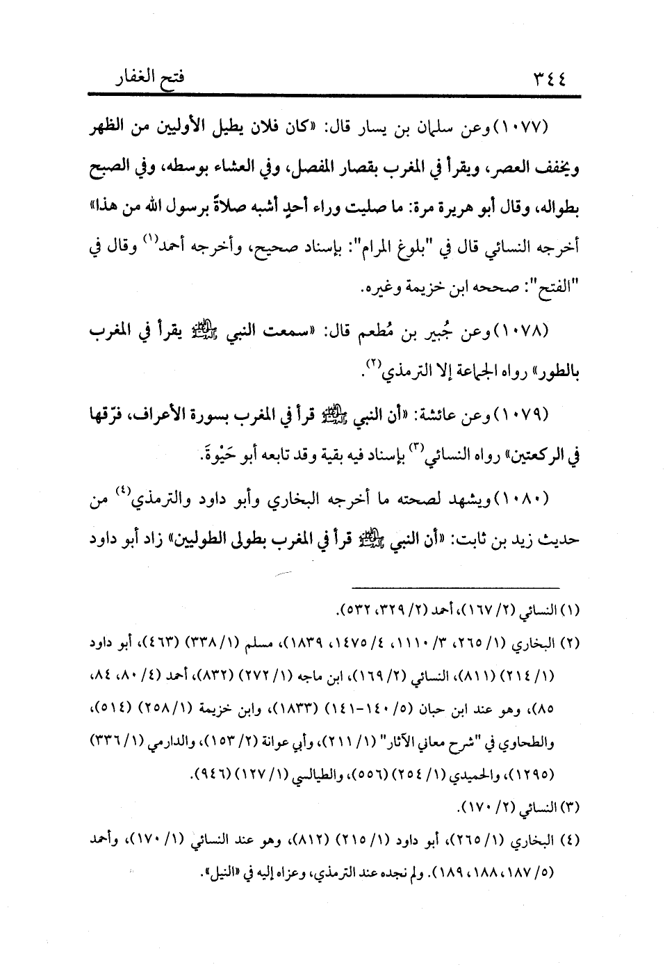 1078 - وعن جُبير بن مُطعم قال: «سمعت النبي - صلى الله عليه وسلم - يقرأ في المغرب بالطور» رواه الجماعة إلا الترمذي (¬2) .