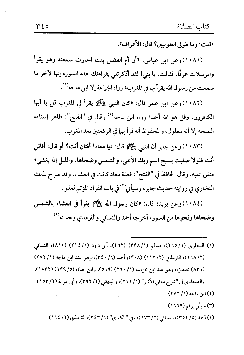 1083 - وعن جابر أن النبي - صلى الله عليه وسلم - قال: «يا معاذ! أفتان أنت؟ أو قال: أفاتن أنت فلولا صليت بسبح اسم ربك الأعلى، والشمس وضحاها، والليل إذا يغشى» متفق عليه، وقال الحافظ في "الفتح": قصة معاذ كانت في العشاء، وقد صرح بذلك البخاري في روايته لحديث جابر، وسيأتي (¬3) في باب انفراد المؤتم لعذر.