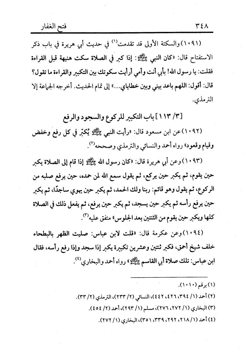 1092 - عن ابن مسعود قال: «رأيت النبي - صلى الله عليه وسلم - يكبر في كل ركعة وخفض وقيام وقعود» رواه أحمد والنسائي والترمذي وصححه (¬2) .