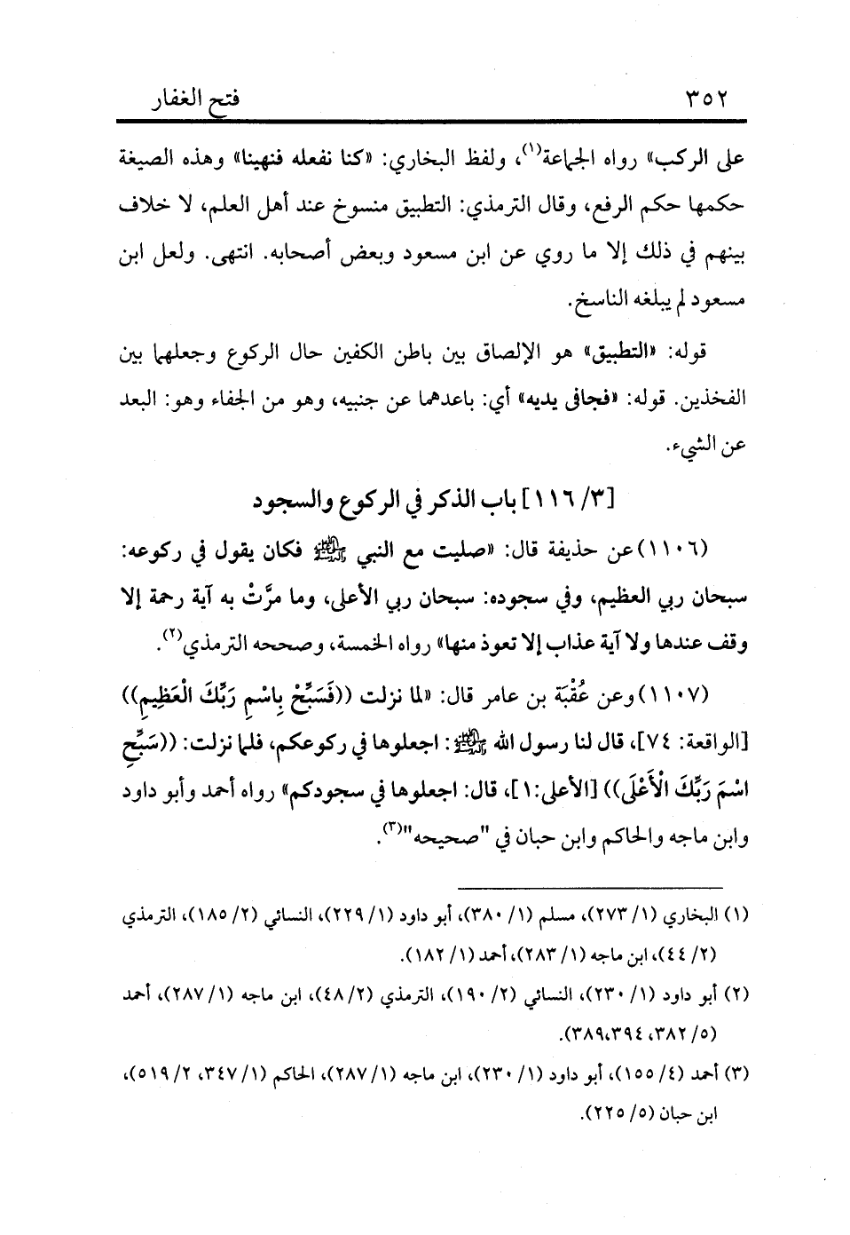 على الركب» رواه الجماعة (¬1) ، ولفظ البخاري: «كنا نفعله فنهينا» وهذه الصيغة حكمها حكم الرفع، وقال الترمذي: التطبيق منسوخ عند أهل العلم، لا خلاف بينهم في ذلك إلا ما روي عن ابن مسعود وبعض أصحابه. انتهى. ولعل ابن مسعود لم يبلغه الناسخ.