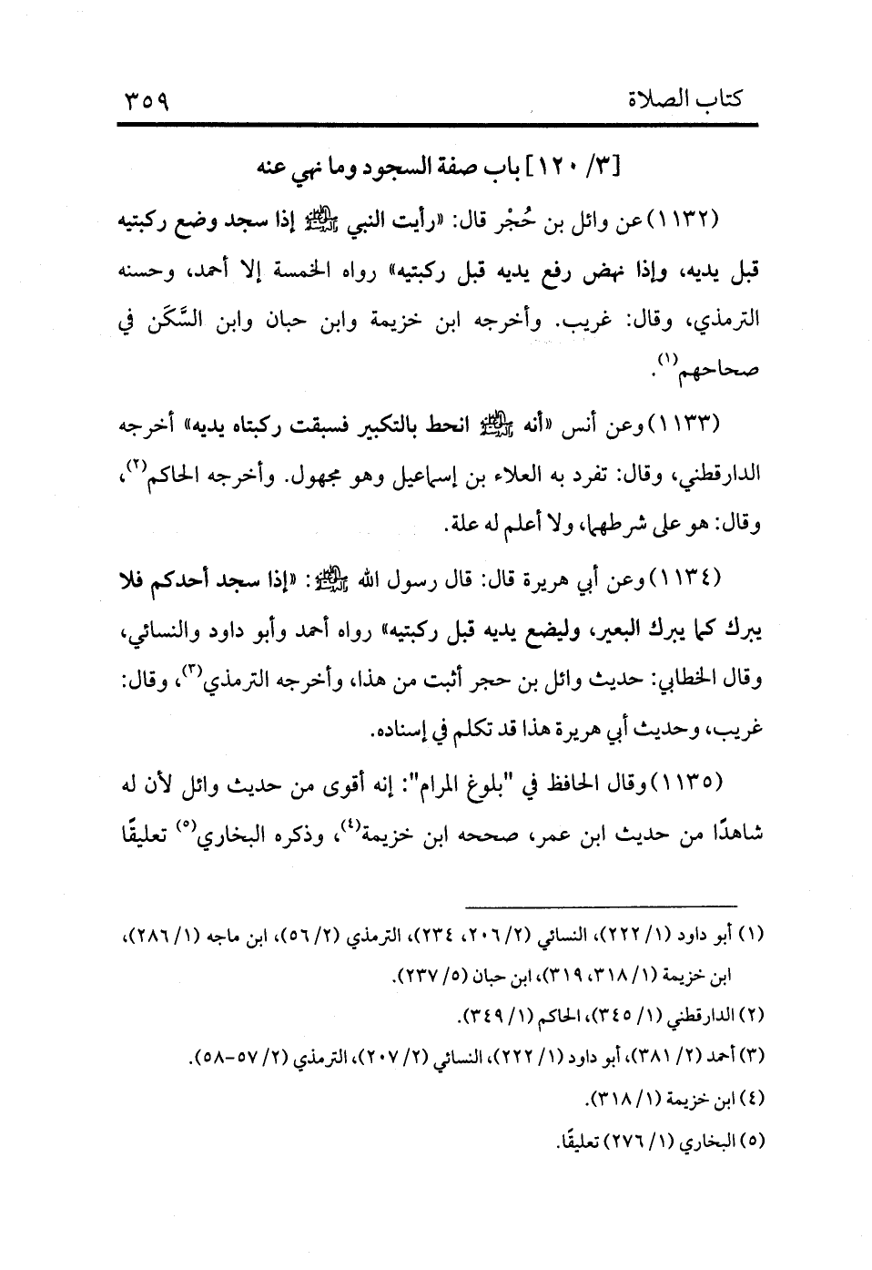 1132 - عن وائل بن حُجْر قال: «رأيت النبي - صلى الله عليه وسلم - إذا سجد وضع ركبتيه قبل يديه، وإذا نهض رفع يديه قبل ركبتيه» رواه الخمسة إلا أحمد، وحسنه الترمذي، وقال: غريب، وأخرجه ابن خزيمة وابن حبان وابن السَّكَن في صحاحهم (¬1) .