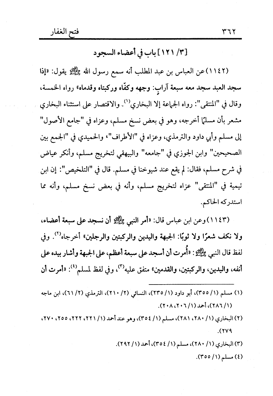 1142 - عن العباس بن عبد المطلب أنه سمع رسول الله - صلى الله عليه وسلم - يقول: «إذا سجد العبد سجد معه سبعة أرابٍ: وجهه وكفّاه وركبتاه وقدماه» رواه الخمسة، وقال في "المنتقى": رواه الجماعة إلا البخاري (¬1) ، والاقتصار على استثناء البخاري مشعر بأن مسلمًا أخرجه، وهو في بعض نسخ مسلم، وعزاه في "جامع الأصول" إلى مسلم وأبي داود والترمذي، وعزاه في الأطراف، والحميدي في الجمع بين الصحيحين وابن الجوزي في جامعه والبيهقي لتخريج مسلم، وأنكر عياض في شرح مسلم، فقال: لم يقع عند شيوخنا في مسلم، قال في "التلخيص" إن ابن تيمية في "المنتقى" عزاه لتخريج مسلم، وأنه في بعض نسخ مسلم، وأنه مما استدركه الحاكم.