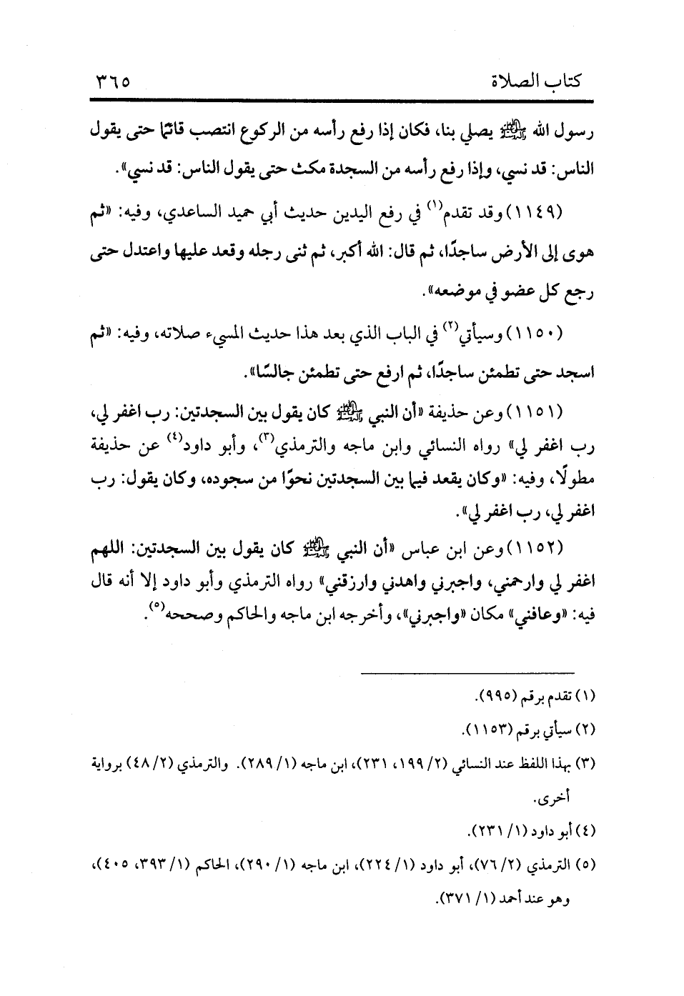 1151 - وعن حذيفة «أن النبي - صلى الله عليه وسلم - كان يقول بين السجدتين: رب اغفر لي، رب اغفر لي» رواه النسائي وابن ماجه والترمذي (¬3) ، وأبو داود (¬4) عن حذيفة مطولًا، وفيه: «وكان يقعد فيما بين السجدتين نحوًا من سجوده، وكان يقول: رب اغفر لي، رب اغفر لي» .