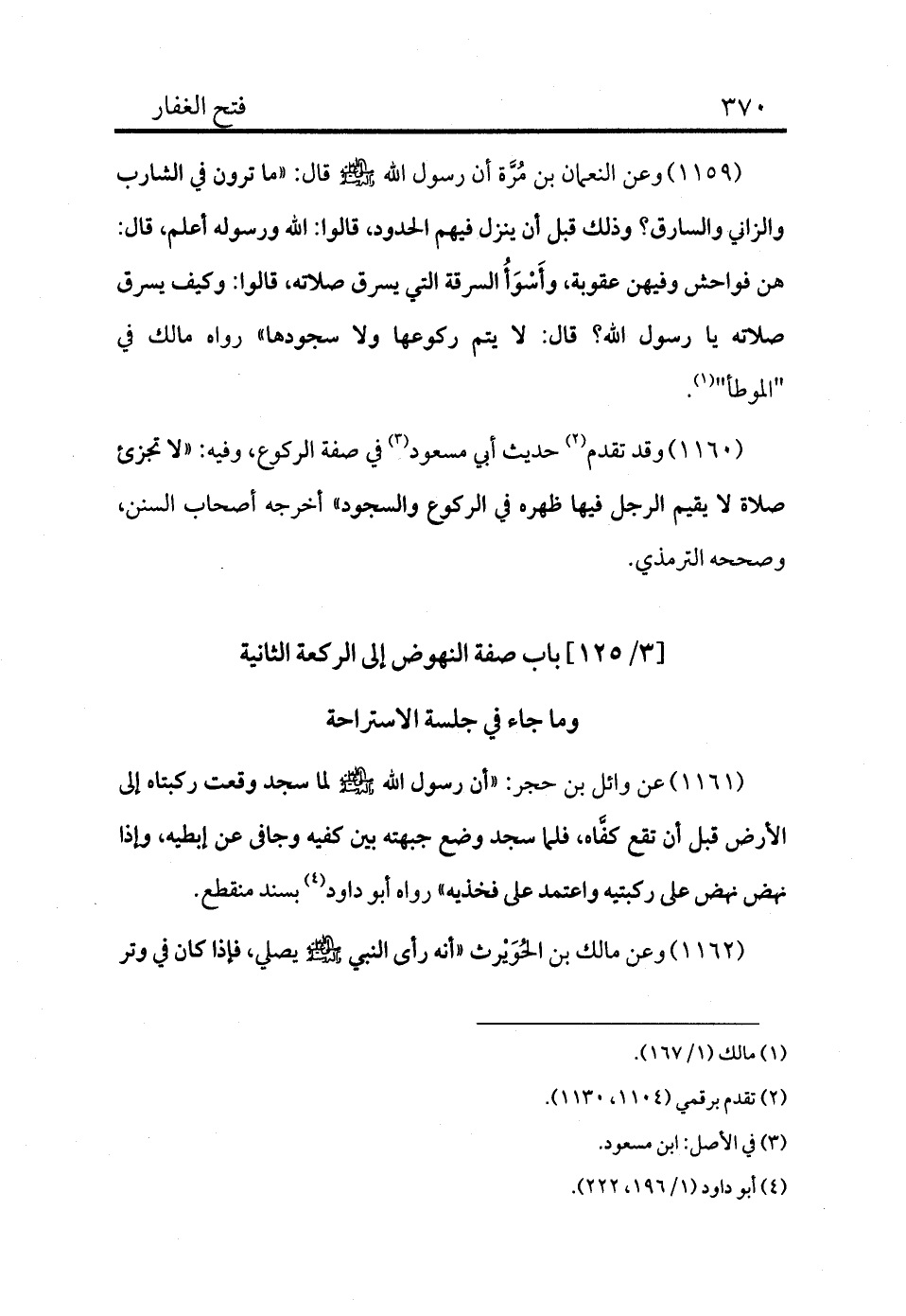 1160 - وقد تقدم (¬2) حديث أبي مسعود (¬3) في صفة الركوع، وفيه: «لا تجزئ صلاة لا يقيم الرجل فيها ظهره في الركوع والسجود» أخرجه أصحاب السنن، وصححه الترمذي.