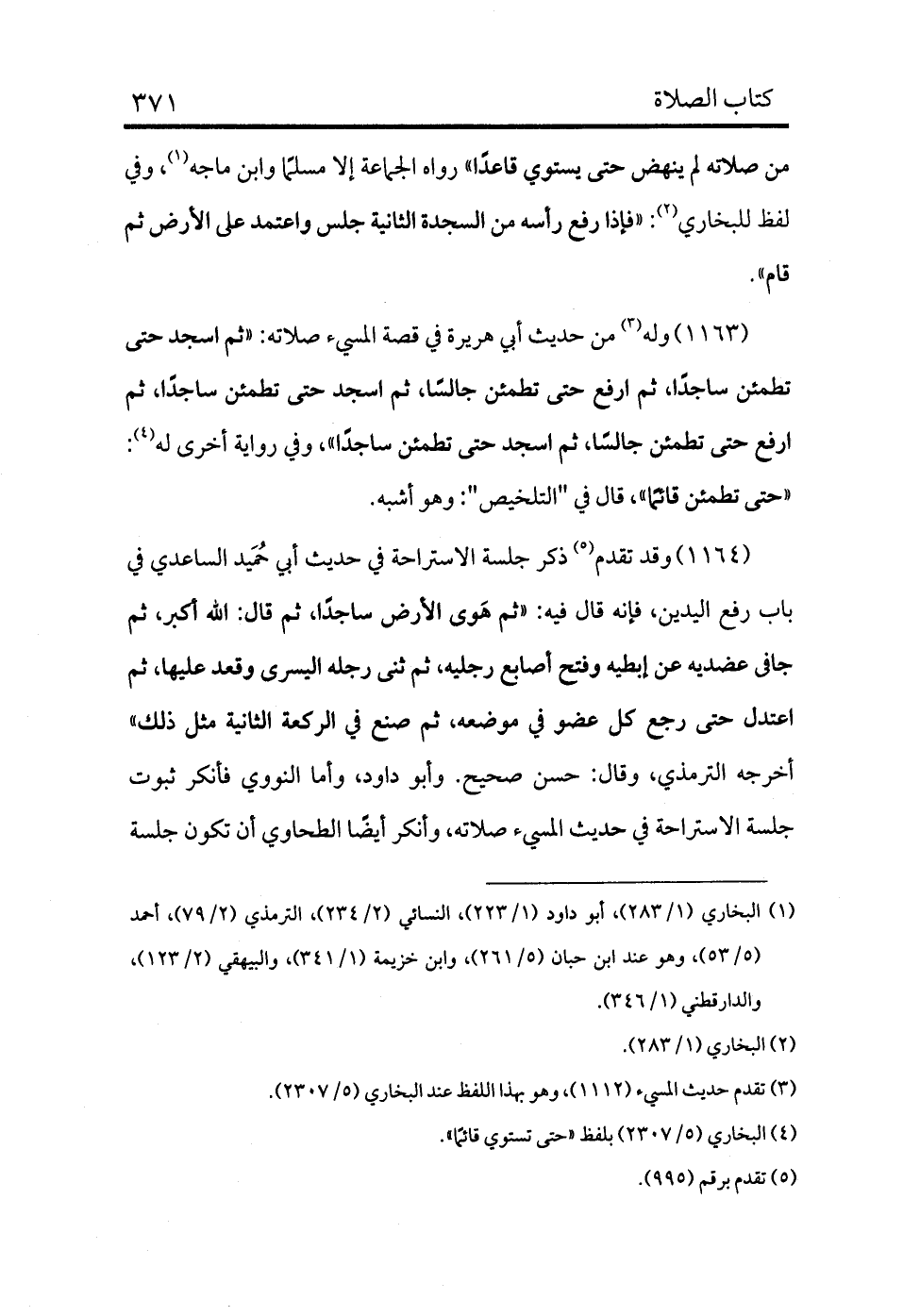 1163 - وله (¬3) من حديث أبي هريرة في قصة المسيء صلاته: «ثم اسجد حتى تطمئن ساجدًا، ثم ارفع حتى تطمئن جالسًا، ثم اسجد حتى تطمئن ساجدًا، ثم ارفع حتى تطمئن جالسًا، ثم اسجد حتى تطمئن ساجدًا» ، وفي رواية أخرى له (¬4) : «حتى تطمئن قائمًا» ، قال في "التلخيص": وهو أشبه.