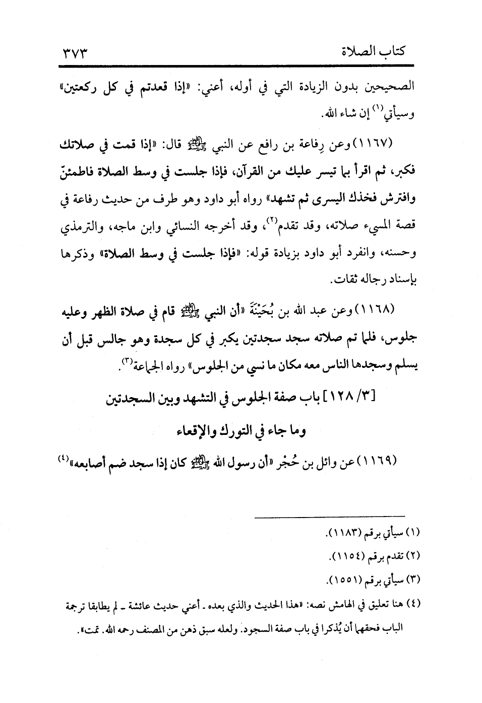 1167 - وعن رِفاعة بن رافع عن النبي - صلى الله عليه وسلم - قال: «إذا قمت في صلاتك فكبر، ثم اقرأ بما تيسر عليك من القرآن، فإذا جلست في وسط الصلاة فاطمئنّ وافترش فخذك اليسرى ثم تشهد» رواه أبو داود وهو طرف من حديث رفاعة في قصة المسيء صلاته، وقد تقدم (¬2) ، وقد أخرجه النسائي وابن ماجه، والترمذي وحسنه، وانفرد أبو داود بزيادة قوله: «فإذا جلست في وسط الصلاة» وذكرها بإسناد رجاله ثقات.