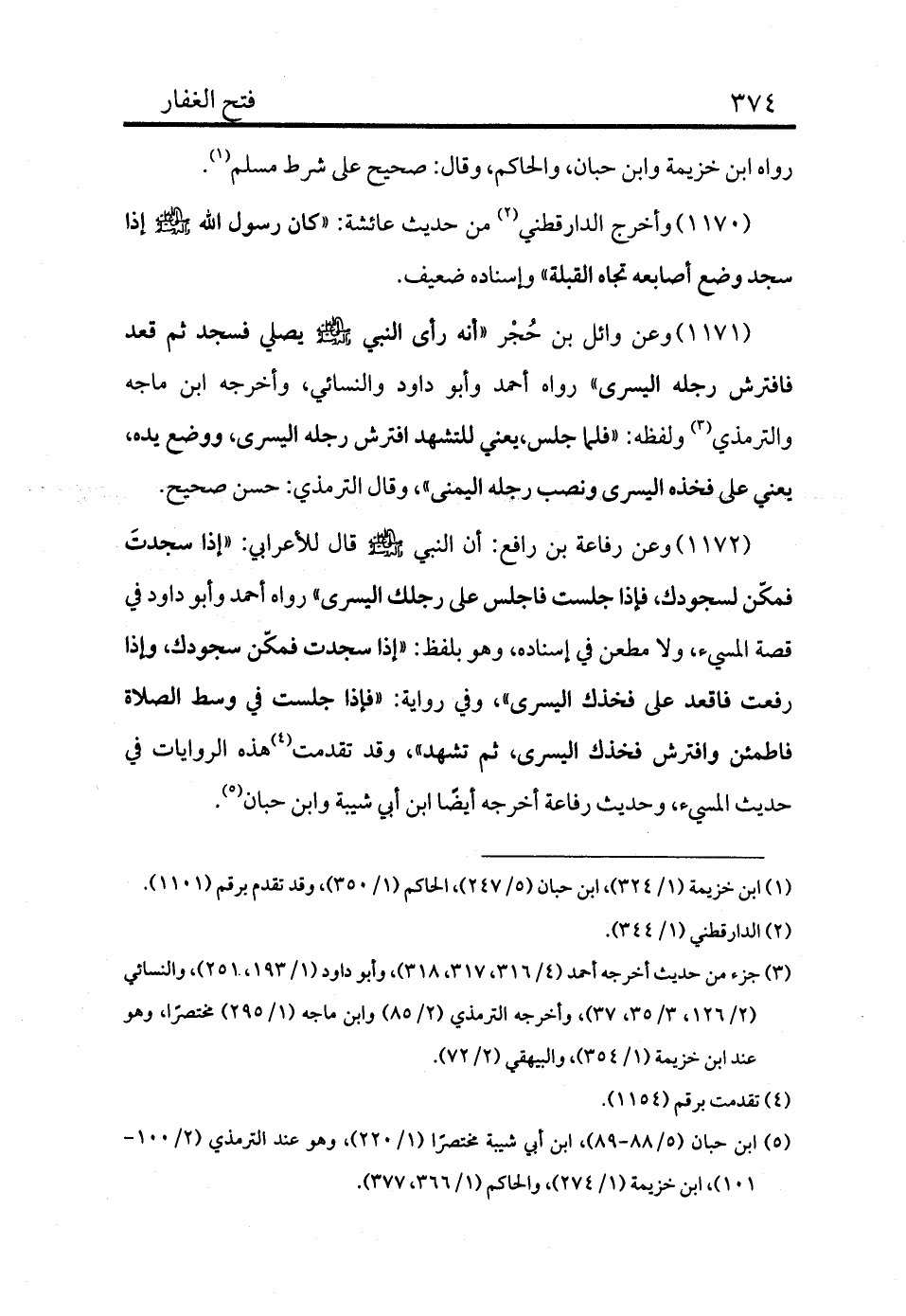 1172 - وعن رفاعة بن رافع: أن النبي - صلى الله عليه وسلم - قال للأعرابي: «إذا سجدت فمكن لسجودك، فإذا جلست فاجلس على رجلك اليسرى» رواه أحمد وأبو داود في قصة المسيء، ولا مطعن في إسناده، وهو بلفظ: «إذا سجدت فمكن سجودك، وإذا رفعت فاقعد على فخذك اليسرى» ، وفي رواية: «فإذا جلست في وسط الصلاة فاطمئن وافترش فخذك اليسرى، ثم تشهد» ، وقد تقدمت (¬4) هذه الروايات في حديث المسيء، وحديث رفاعة أخرجه أيضًا ابن أبي شيبة وابن حبان (¬5) .