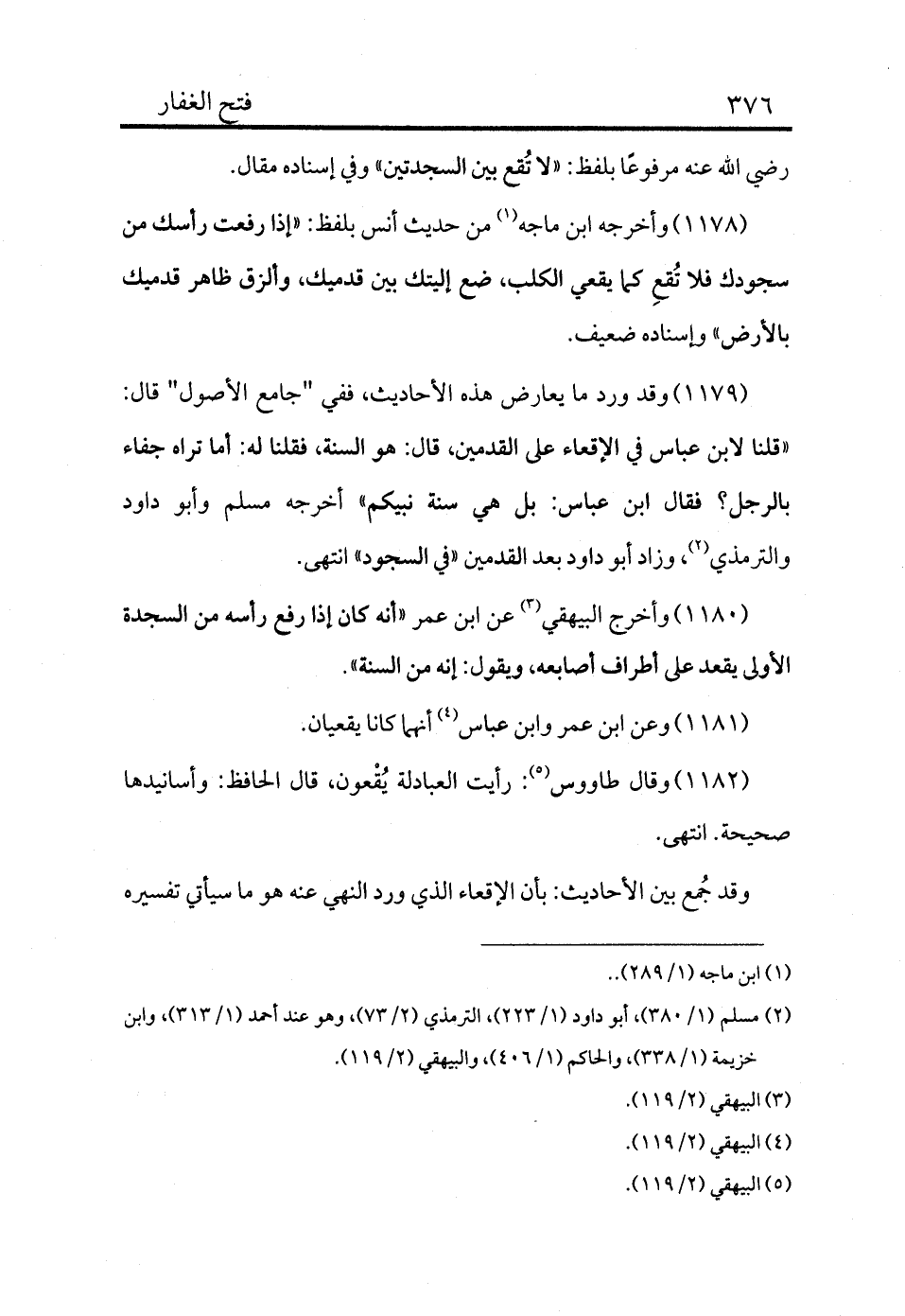 1180 - وأخرج البيهقي (¬3) عن ابن عمر «أنه كان إذا رفع رأسه من السجدة الأولى يقعد على أطراف أصابعه، ويقول: إنه من السنة» .
