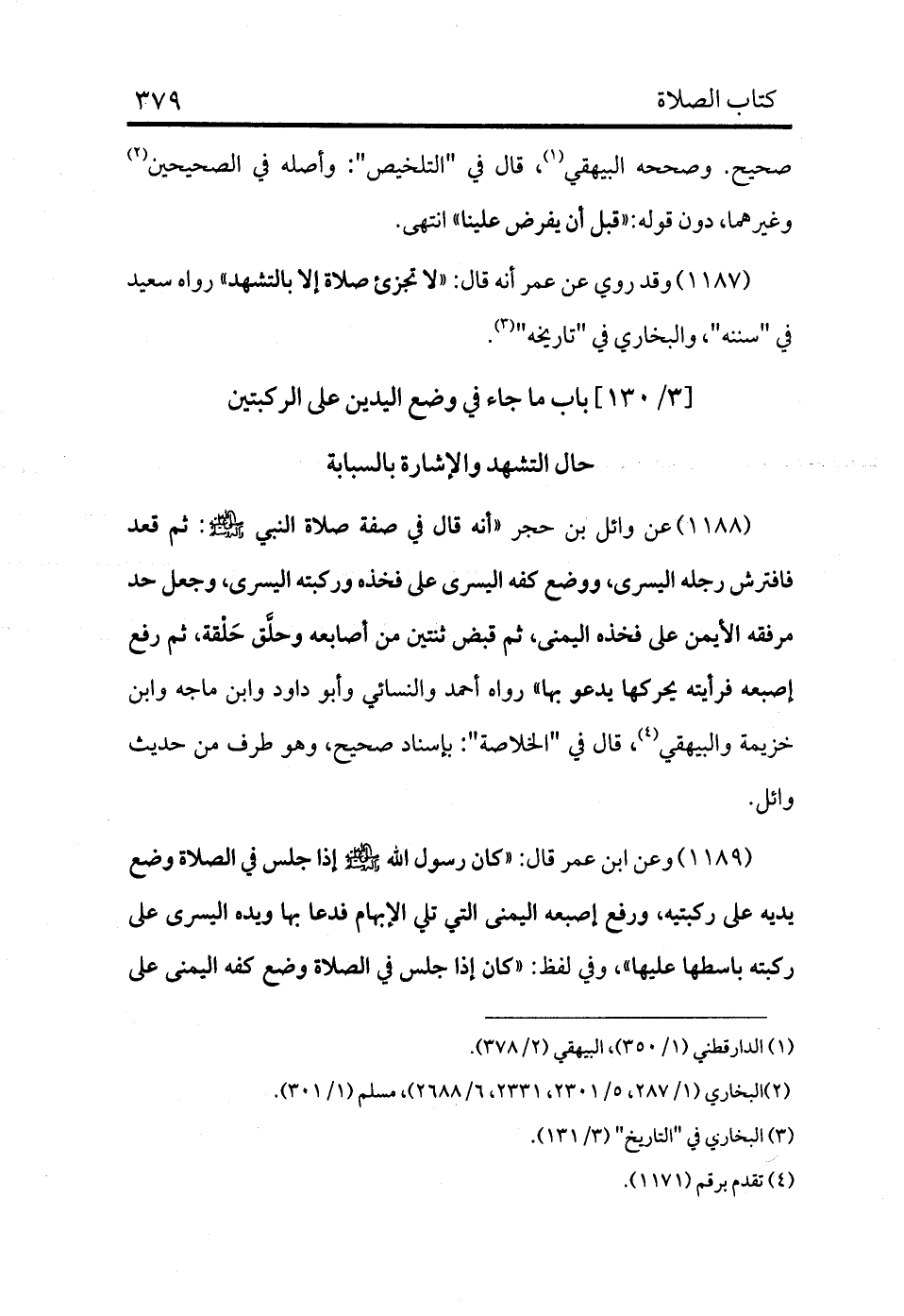1189 - وعن ابن عمر قال: «كان رسول الله - صلى الله عليه وسلم - إذا جلس في الصلاة وضع يديه على ركبتيه، ورفع إصبعه اليمنى التي تلي الإبهام فدعا بها ويده اليسرى على ركبته باسطها عليها» ، وفي لفظ: «كان إذا جلس في الصلاة وضع كفه اليمنى على