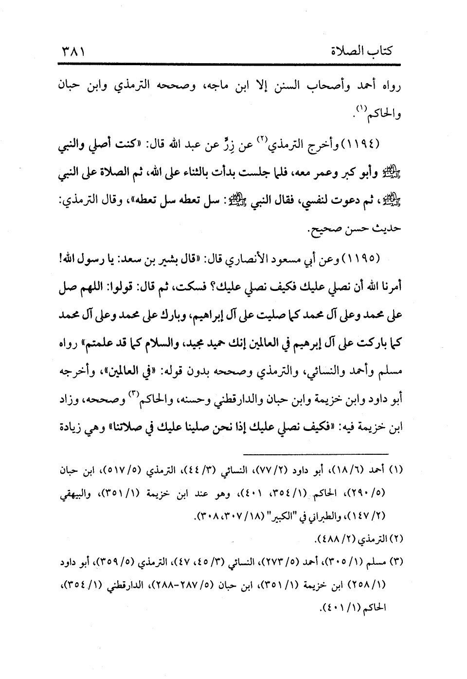1195 - وعن أبي مسعود الأنصاري قال: «قال بشير بن سعد: يا رسول الله! أمرنا الله أن نصلي عليك فكيف نصلي عليك؟ فسكت، ثم قال: قولوا: اللهم صل على محمد وعلى آل محمد كما صليت على آل إبراهيم، وبارك على محمد وعلى آل محمد كما باركت على آل إبرهيم في العالمين إنك حميد مجيد، والسلام كما قد علمتم» رواه مسلم وأحمد والنسائي، والترمذي وصححه بدون قوله: «في العالمين» ، وأخرجه أبو داود وابن خزيمة وابن حبان والدارقطني وحسنه، والحاكم (¬3) وصححه، وزاد ابن خزيمة فيه: «فكيف نصلي عليك إذا نحن صلينا عليك في صلاتنا» وهي زيادة