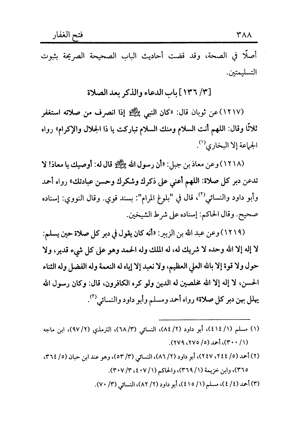 1217 - عن ثوبان قال: «كان النبي - صلى الله عليه وسلم - إذا انصرف من صلاته استغفر ثلاثًا وقال: اللهم أنت السلام ومنك السلام تباركت يا ذا الجلال والإكرام» رواه الجماعة إلا البخاري (¬1) .