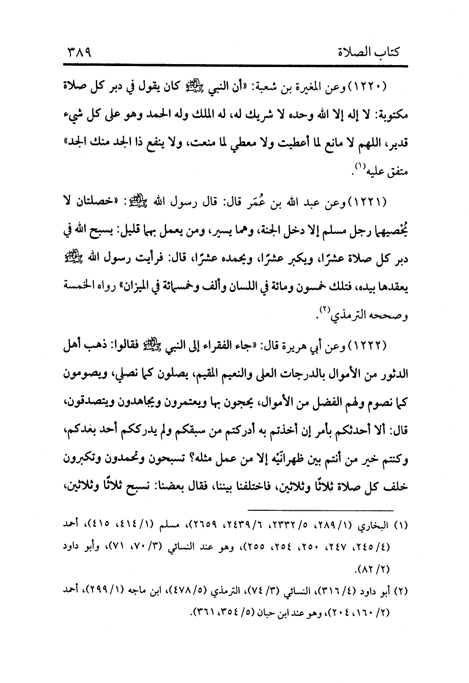 1222 - وعن أبي هريرة قال: «جاء الفقراء إلى النبي - صلى الله عليه وسلم - فقالوا: ذهب أهل الدثور من الأموال بالدرجات العلى والنعيم المقيم، يصلون كما نصلي، ويصومون كما نصوم ولهم الفضل من الأموال، يحجون بها ويعتمرون ويجاهدون ويتصدقون، قال: ألا أحدثكم بأمر إن أخذتم به أدركتم من سبقكم ولم يدرككم أحد بعدكم، وكنتم خير من أنتم بين ظهرانَيْه إلا من عمل مثله؟ تسبحون وتحمدون وتكبرون خلف كل صلاة ثلاثًا وثلاثين، فاختلفنا بيننا، فقال بعضنا نسبح ثلاثًا وثلاثين،