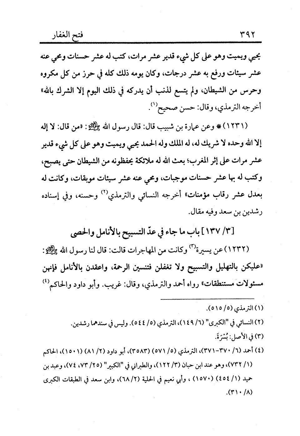 1232 - عن يسيرة (¬3) وكانت من المهاجرات قالت: قال لنا رسول الله - صلى الله عليه وسلم -: «عليكن بالتهليل والتسبيح ولا تغفلن فتنسين الرحمة، واعقدن بالأنامل فإنهن مسئولات مستنطقات» رواه أحمد والترمذي، وقال: غريب، وأبو داود والحاكم (¬4)
