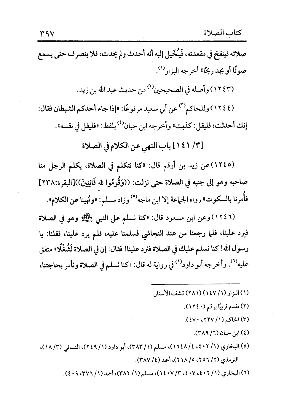 1245 - عن زيد بن أرقم قال: «كنا نتكلم في الصلاة، يكلم الرجل منا صاحبه وهو إلى جنبه في الصلاة حتى نزلت: ((وَقُومُوا لِلَّهِ قَانِتِينَ)) [البقرة:238] فأمرنا بالسكوت» رواه الجماعة إلا ابن ماجه (¬5) وزاد مسلم: «ونُهينا عن الكلام» .