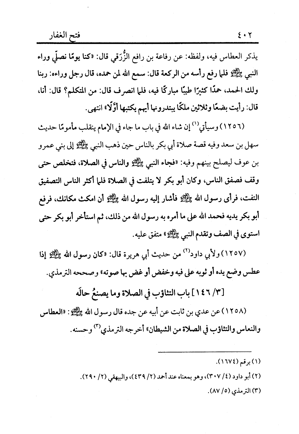 1258 - عن عدي بن ثابت عن أبيه عن جده قال رسول الله - صلى الله عليه وسلم -: «العطاس والنعاس والتثاؤب في الصلاة من الشيطان» أخرجه الترمذي (¬3) وحسنه.