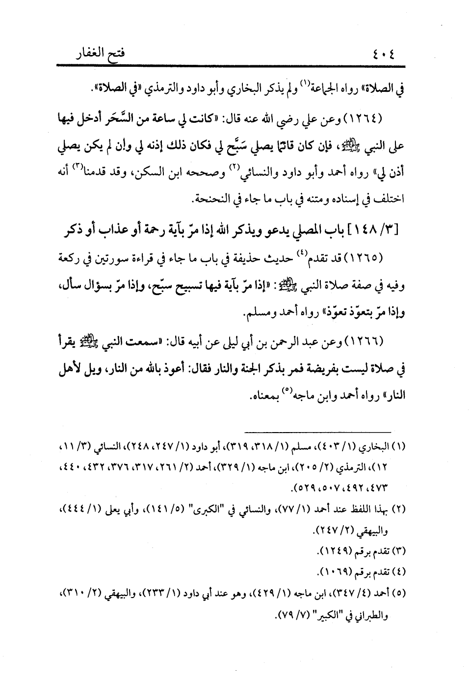 1266 - وعن عبد الرحمن بن أبي ليلى عن أبيه قال: «سمعت النبي - صلى الله عليه وسلم - يقرأ في صلاة ليست بفريضة فمر بذكر الجنة والنار فقال: أعوذ بالله من النار، ويل لأهل النار» رواه أحمد وابن ماجه (¬5) بمعناه.