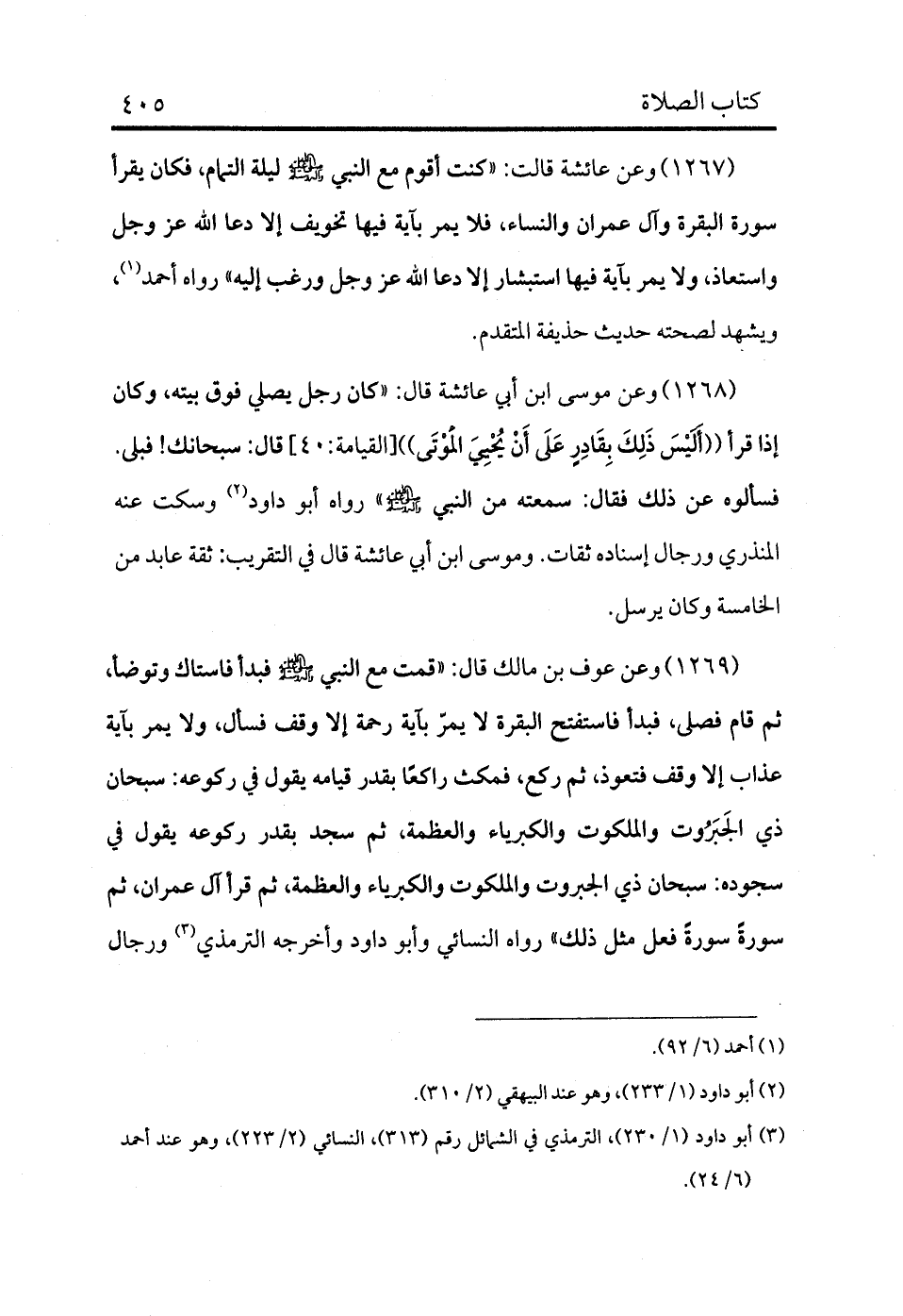1269 - وعن عوف بن مالك قال: «قمت مع النبي - صلى الله عليه وسلم - فبدأ فاستاك وتوضأ، ثم قام فصلى فبدأ، فاستفتح البقرة لا يمرّ بآية رحمة إلا وقف فسأل، ولا يمر بآية عذاب إلا وقف فتعوذ ثم ركع، فمكث راكعًا بقدر قيامه يقول في ركوعه: سبحان ذي الجَبَرُوت والملكوت والكبرياء والعظمة! ثم سجد بقدر ركوعه يقول في سجوده: سبحان ذي الجبروت والملكوت والكبرياء والعظمة! ثم قرأ آل عمران، ثم سورةً سورةً فعل مثل ذلك» رواه النسائي وأبو داود وأخرجه الترمذي (¬3) ورجال