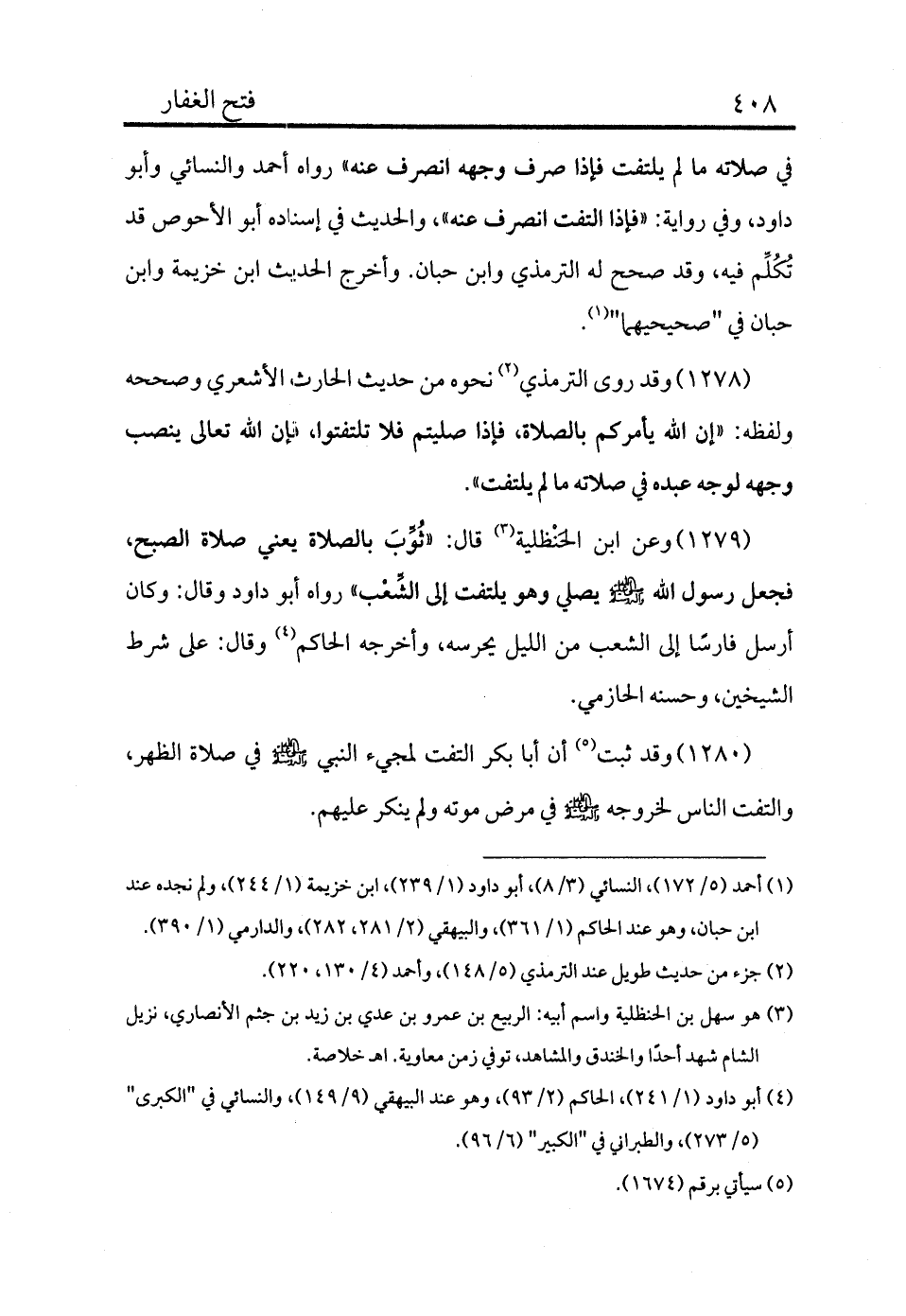 1279 - وعن ابن الحَنْظلية (¬3) قال: «ثوب بالصلاة يعني صلاة الصبح، فجعل رسول الله - صلى الله عليه وسلم - يصلي وهو يلتفت إلى الشِّعْب» رواه أبو داود وقال: وكان أرسل فارسًا إلى الشعب من الليل يحرسه، وأخرجه الحاكم (¬4) وقال: على شرط الشيخين، وحسنه الحازمي.