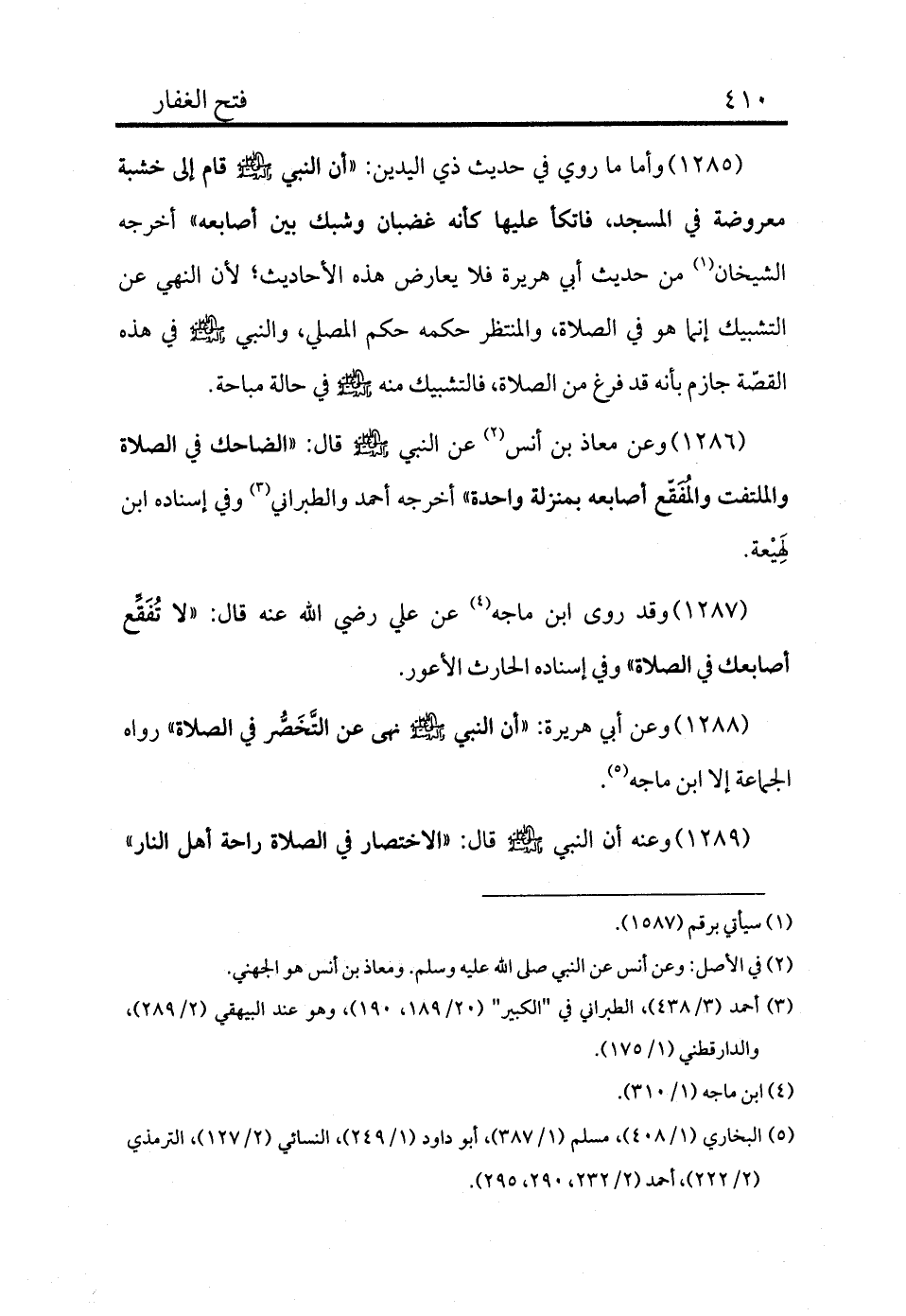 1287 - وقد روى ابن ماجه (¬4) عن علي رضي الله عنه قال: «لا تفقع أصابعك في الصلاة» وفي إسناده الحارث الأعور.