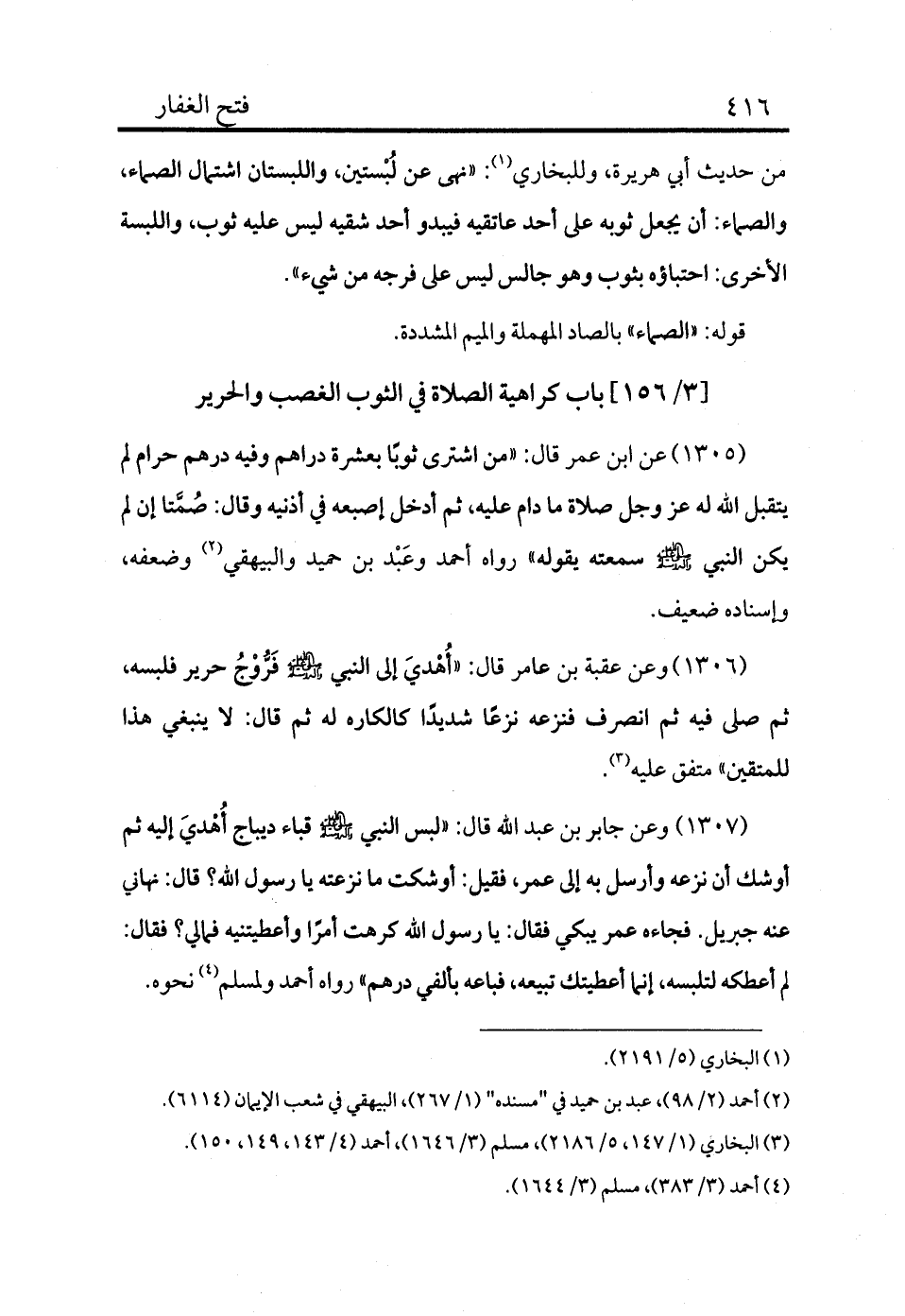 1305 - عن ابن عمر قال: «من اشترى ثوبًا بعشرة دراهم وفيه درهم حرام لم يتقبل الله له عز وجل صلاة ما دام عليه، ثم أدخل إصبعه في أذنيه وقال: صمّتا إن لم يكن النبي - صلى الله عليه وسلم - سمعته يقوله» رواه أحمد وعَبْد بن حميد والبيهقي (¬2) وضعفه، وإسناده ضعيف.