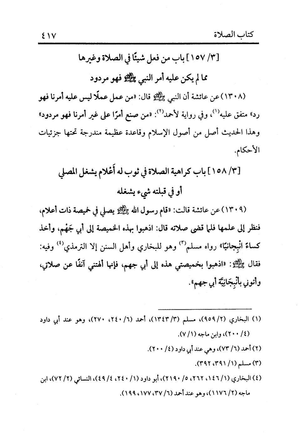 1309 - عن عائشة قالت: «قام رسول الله - صلى الله عليه وسلم - يصلي في خميصة ذات أعلام، فنظر إلى علمها فلما قضى صلاته قال: اذهبوا بهذه الخميصة إلى أبي جَهْم، وأخذ كساءً انبجانيًا» رواه مسلم (¬3) وهو للبخاري وأهل السنن إلا الترمذي (¬4) وفيه: فقال - صلى الله عليه وسلم -: «اذهبوا بخميصتي هذه إلى أبي جهم، فإنها ألهتني آنفًا عن صلاتي، وأتوني بأنْبَجَانِيَّة أبي جهم» .