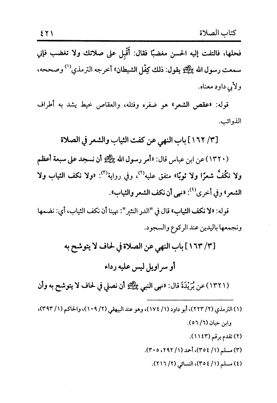 1320 - عن ابن عباس قال: «أمر رسول الله - صلى الله عليه وسلم - أن نسجد على سبعة أعظم ولا نكف شعرًا ولا ثوبًا» متفق عليه (¬2) ، وفي رواية (¬3) : «ولا نكف الثياب ولا الشعر» وفي أخرى (¬4) : «نهى أن نكف الشعر والثياب» .
