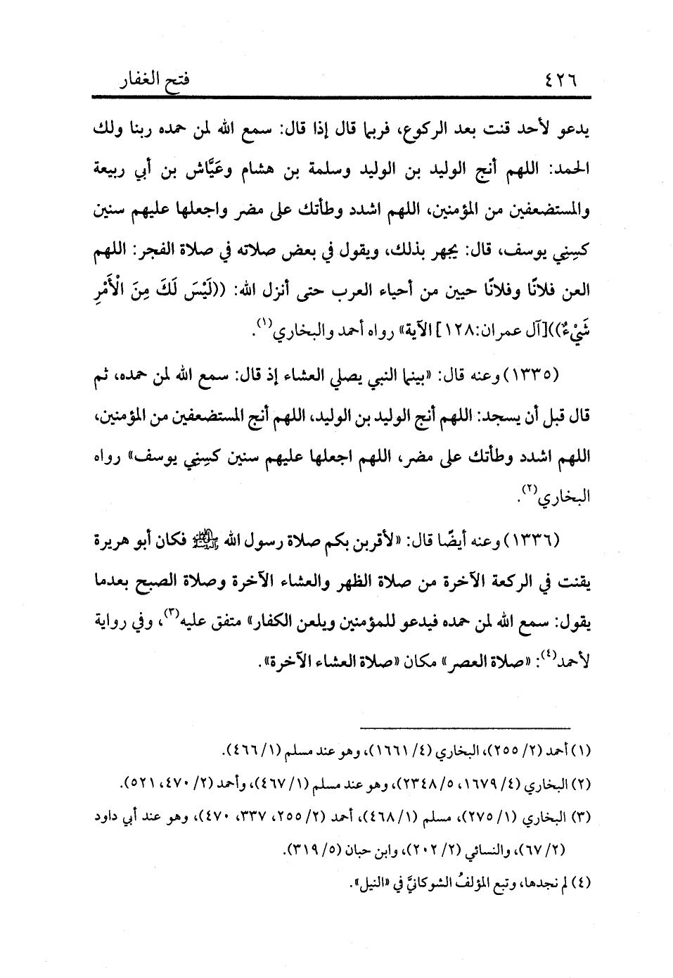 1336 - وعنه أيضًا قال: «لأقربن بكم صلاة رسول الله - صلى الله عليه وسلم - فكان أبو هريرة يقنت في الركعة الآخرة من صلاة الظهر والعشاء الآخرة وصلاة الصبح بعدما يقول: سمع الله لمن حمده فيدعو للمؤمنين ويلعن الكفار» متفق عليه (¬3) ، وفي رواية لأحمد (¬4) : «صلاة العصر» مكان «صلاة العشاء الآخرة» .
