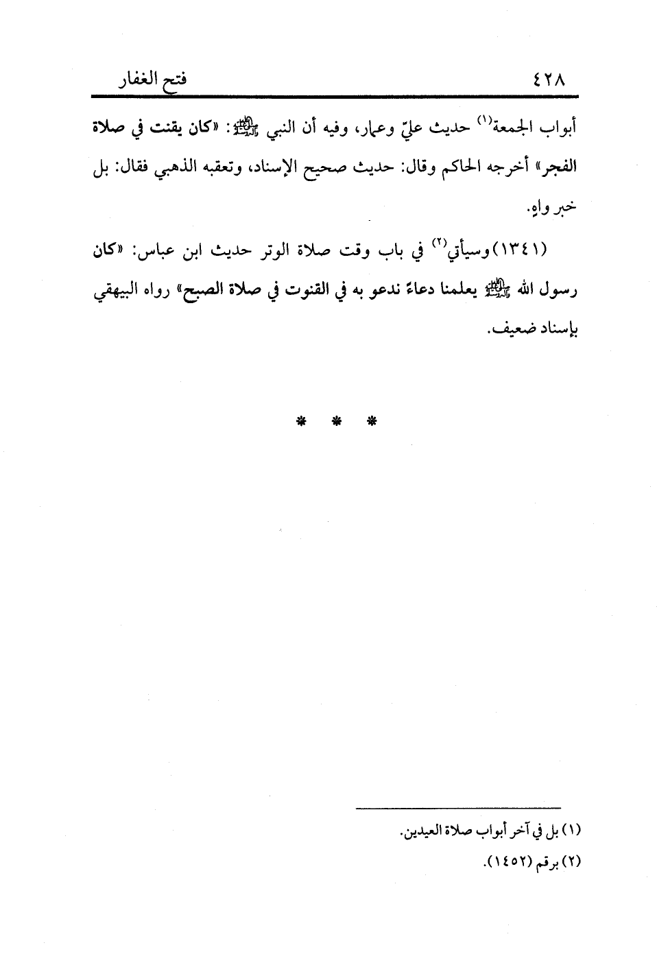 1341 - وسيأتي (¬2) في باب وقت صلاة الوتر حديث ابن عباس: «كان رسول الله - صلى الله عليه وسلم - يعلمنا دعاء ندعو به في القنوت في صلاة الصبح» رواه البيهقي بإسناد ضعيف.