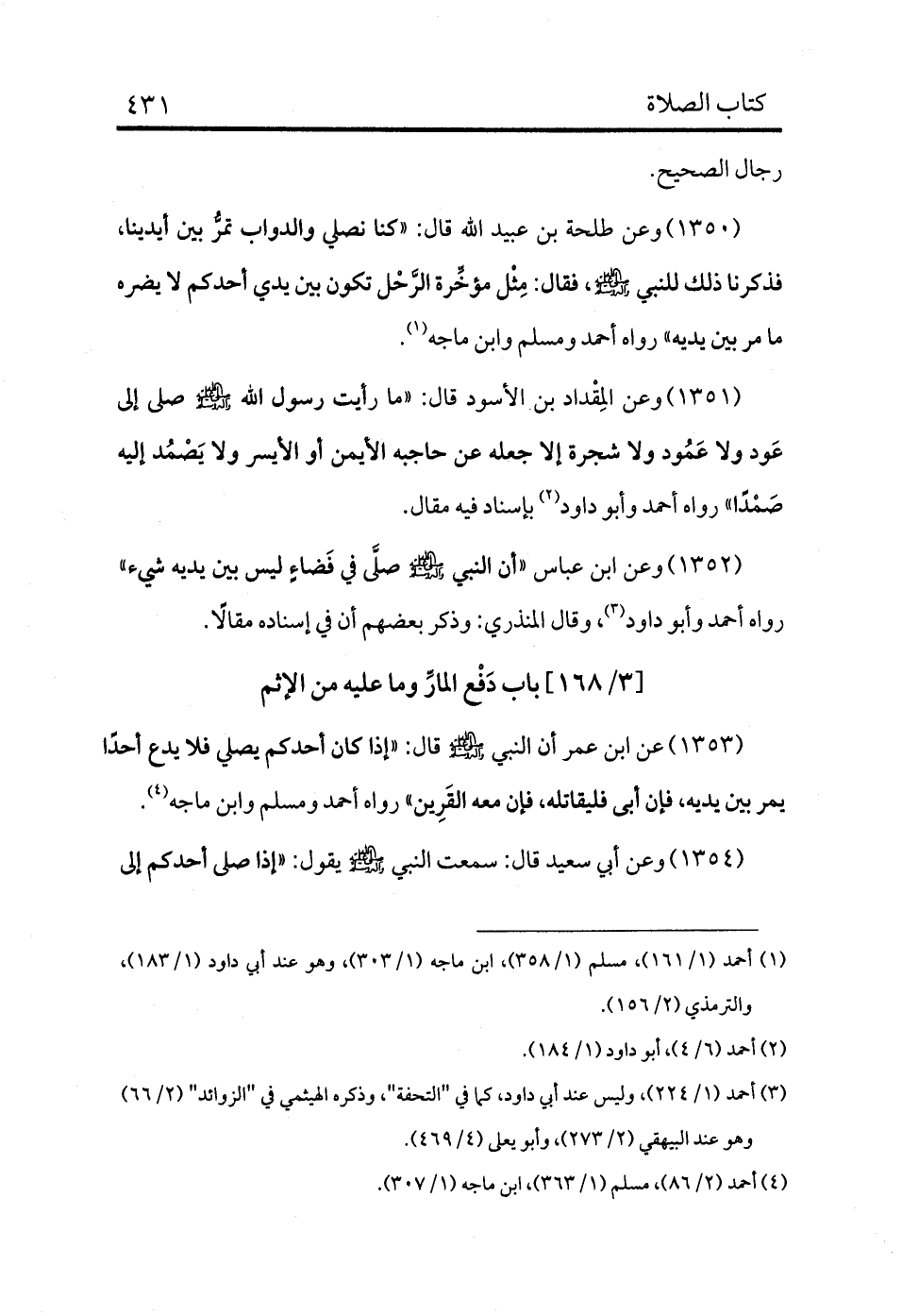 1350 - وعن طلحة بن عبيد الله قال: «كنا نصلي والدواب تمرّ بين أيدينا، فذكرنا ذلك للنبي - صلى الله عليه وسلم -، فقال: مثل مؤخرة الرحل تكون بين يدي أحدكم لا يضره ما مر بين يديه» رواه أحمد ومسلم وابن ماجه (¬1) .