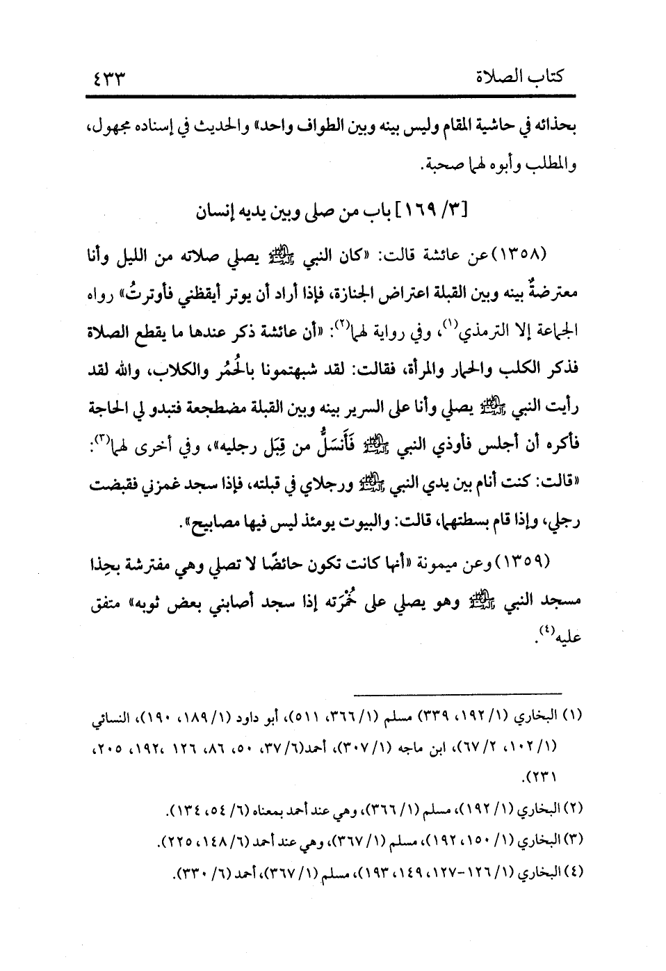 1358 - عن عائشة قالت: «كان النبي - صلى الله عليه وسلم - يصلي صلاته من الليل وأنا معترضة بينه وبين القبلة اعتراض الجنازة، فإذا أراد أن يوتر أيقظني فأوترت» رواه الجماعة إلا الترمذي (¬1) ، وفي رواية لهما (¬2) : «أن عائشة ذكر عندها ما يقطع الصلاة فذكر الكلب والحمار والمرأة، فقالت: لقد شبهتمونا بالحُمُر والكلاب، والله لقد رأيت النبي - صلى الله عليه وسلم - يصلي وأنا على السرير بينه وبين القبلة مضطجعة فتبدو لي الحاجة فأكره أن أجلس فأوذي النبي - صلى الله عليه وسلم - فَأَنسَلُّ من قِبَل رجليه» ، وفي أخرى لهما (¬3) : «قالت: كنت أنام بين يدي النبي - صلى الله عليه وسلم - ورجلاي في قبلته، فإذا سجد غمزني فقبضت رجلي، وإذا قام بسطتهما، قالت: والبيوت يومئذ ليس فيها مصابيح» .