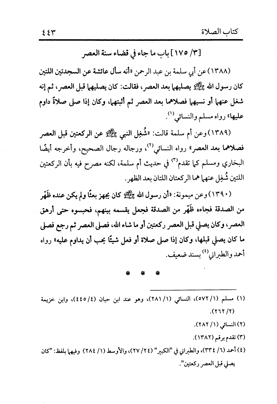 1388 - عن أبي سلمة بن عبد الرحمن «أنه سأل عائشة عن السجدتين اللتين كان رسول الله - صلى الله عليه وسلم - يصليهما بعد العصر، فقالت: كان يصليهما قبل العصر، ثم إنه شغل عنهما أو نسيهما فصلاهما بعد العصر ثم أثبتهما، وكان إذا صلى صلاةً دوام عليها» رواه مسلم والنسائي (¬1) .