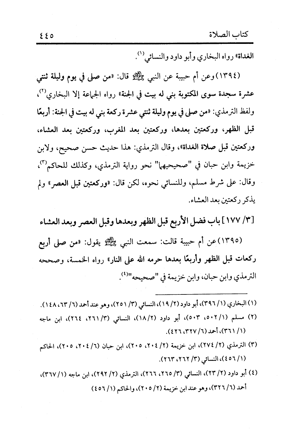 1395 - عن أم حبيبة قالت: سمعت النبي - صلى الله عليه وسلم - يقول: «من صلى أربع ركعات قبل الظهر وأربعًا بعدها حرمه الله على النار» رواه الخمسة، وصححه الترمذي وابن حبان، وابن خزيمة في "صحيحه" (¬4) .