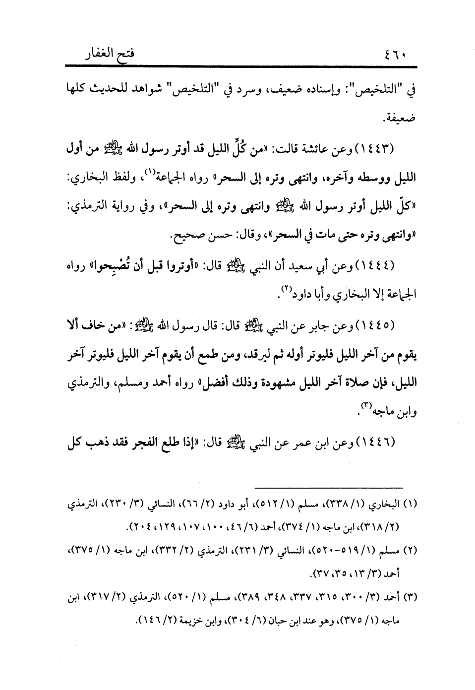1446 - وعن ابن عمر عن النبي - صلى الله عليه وسلم - قال: «إذا طلع الفجر فقد ذهب كل