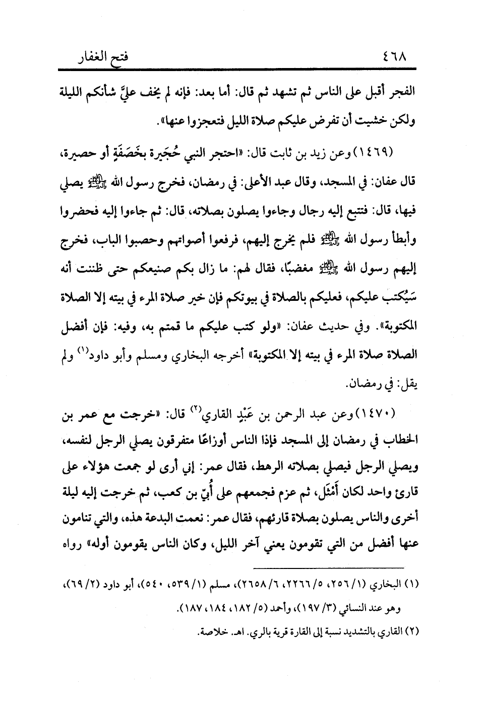 1469 - وعن زيد بن ثابت قال: «احتجر الناس حُجَيرة بخَصَفَةٍ أو حصيرة، قال عفان: في المسجد، وقال عبد الأعلى: في رمضان، فخرج رسول الله - صلى الله عليه وسلم - يصلي فيها، قال: فتتبع إليه رجال وجاءوا يصلون بصلاته، قال: ثم جاءوا إليه فحضروا وأبطأ رسول الله - صلى الله عليه وسلم - فلم يخرج إليهم، فرفعوا أصواتهم وحصبوا الباب، فخرج إليهم رسول الله - صلى الله عليه وسلم - مغضبًا، فقال لهم: ما زال بكم صنيعكم حتى ظنتت أنه سيكتب عليكم، فعليكم بالصلاة في بيوتكم فإن خير صلاة المرء في بيته إلا الصلاة المكتوبة» . وفي حديث عفان: «ولو كتب عليكم ما قمتم به، وفيه: فإن أفضل الصلاة صلاة المرء في بيته إلا المكتوبة» أخرجه البخاري ومسلم وأبو داود (¬1) ولم يقل: في رمضان.