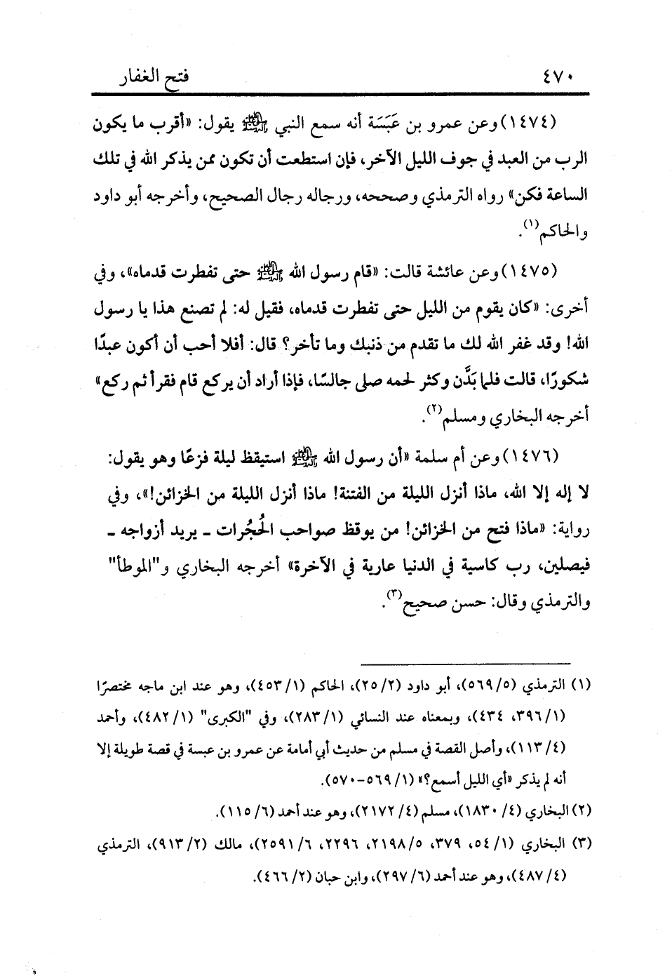 1474 - وعن عمرو بن عَبَسَة أنه سمع النبي - صلى الله عليه وسلم - يقول: «أقرب ما يكون الرب من العبد في جوف الليل الآخر، فإن استطعت أن تكون ممن يذكر الله في تلك الساعة فكن» رواه الترمذي وصححه، ورجاله رجال الصحيح، وأخرجه أبو داود والحاكم (¬1) .